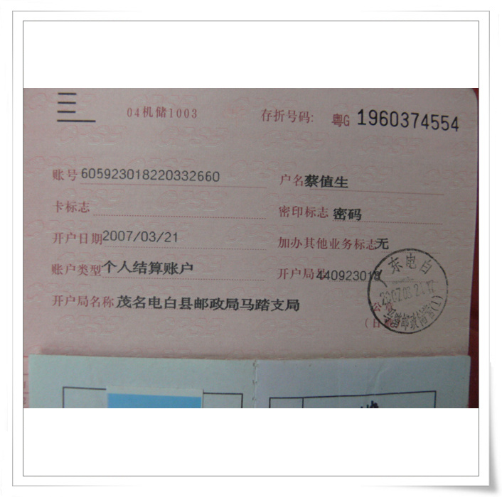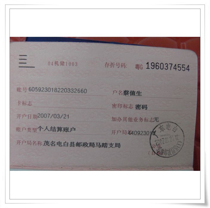 开户邮局:茂名电白县邮政局马踏支局