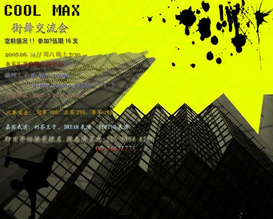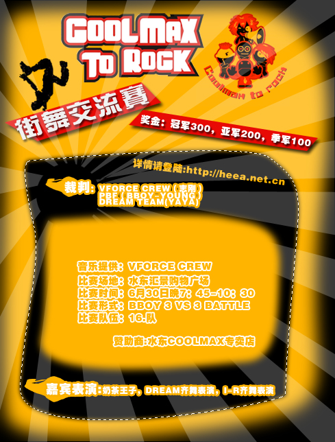 【 COOL MAX.街舞交流会 】 裁判: ( B-BOY.YOUNG. B-BOY.Keane DREAM.丫丫 ) 比赛时间:6月30日 晚上 7:30 比赛场地:水东汇景购物广场中心. 比赛形式:BBOY 3 VS 3 BATTLE ( 参加队伍限16支 ) 嘉宾表演:奶茶王子. DREAM表演. POPING表演 比赛奖金: 冠军300,亚军200,季军100