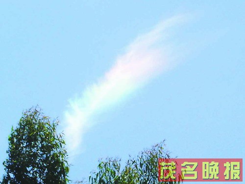 前日中午约1时10分,记者采访归来途经电白县电城镇时,无意中抬头向天空一望,远远看见325国道西南方向的空中有一抹彩色的云,乍一看,彩云呈红、黄、蓝三色,但颜色不算明显,颇似一株成熟了的禾穗。随后车辆到了麻岗镇路段,彩云的红、黄、蓝三色已十分明显,而仔细观察,黄色与蓝色之间又多了一种青色,变成了四色禾穗――红色及黄色的谷穗,青色及蓝色的禾杆。谷穗尾指向西北,禾杆头则指向东南。