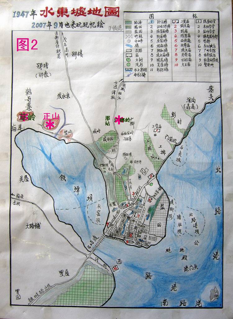地图绘画的也较生动,如图标、颜色、水东湾海水的深浅度等,文字书写也有点古韵味,特别是“水东墟地图”这几个隶体字。 铁潭坝应是现在的西湖吧,比原来小了很多,上排垌##应是东湖了,原来是沼泽地,车站位置好象不变,而海岸线往外推出了很多。