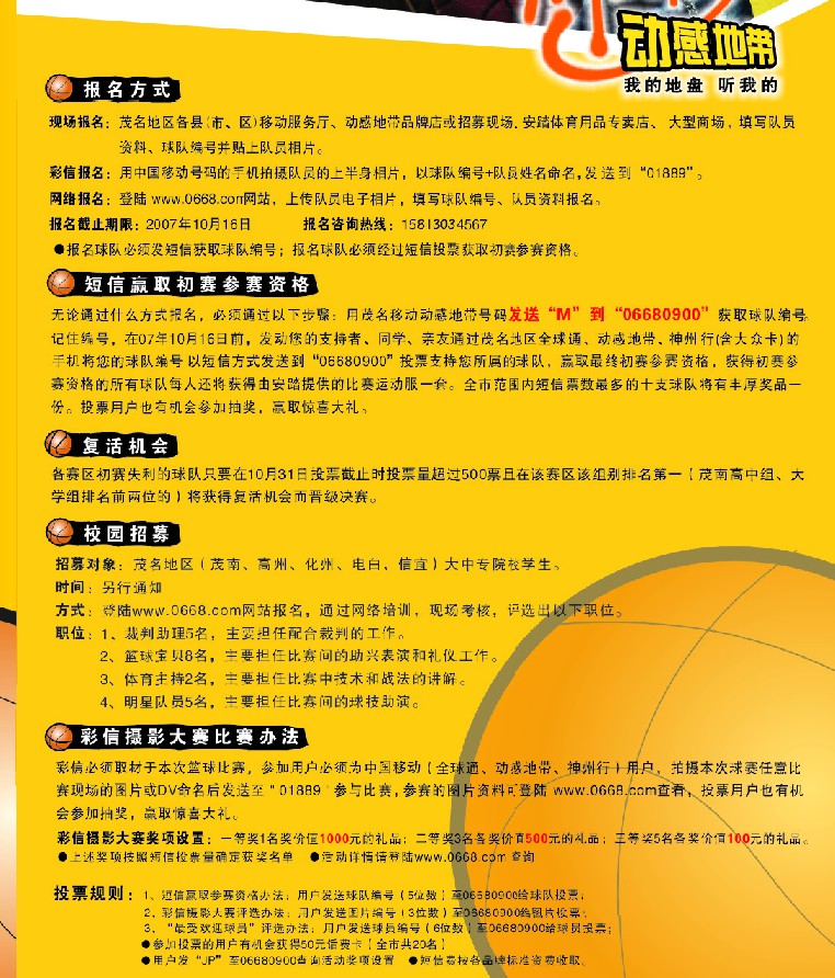 2、举行一个比赛,也只是想给篮球爱好者提供一个竞技的平台,严格来说,这仅仅是一个品牌营销,就是为了让更多的人认识动感地带!