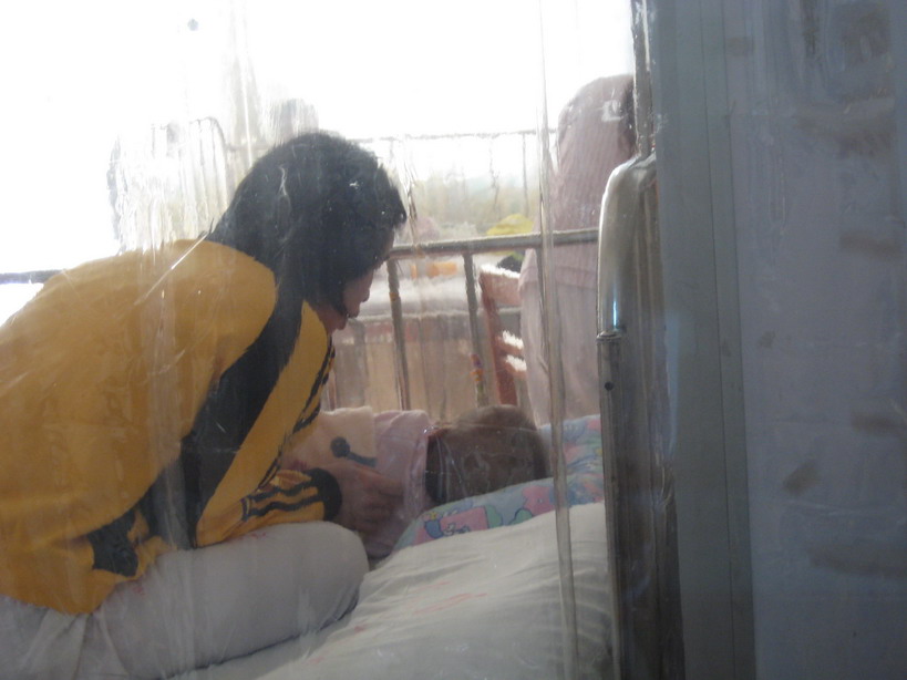 今天下午二点多,邀上论坛的liaojieying同乡在天河城买了点水果和牛奶就前往了医院探望小朋友.小朋友刚好在睡觉,便陪了小朋友的外婆(一直在广州陪候的老人家)聊了起来.老人家比上次见到时稍微坚强了点,却还是不时说到泪满襟...后来,小朋友醒来,我隔着窗和隔离胶偷拍了些图片...