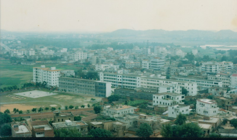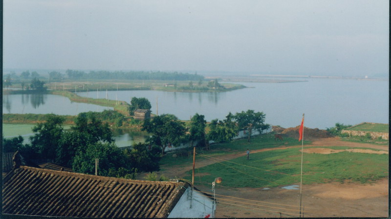 2002年在登楼小学拍摄的池塘绿树古庙.