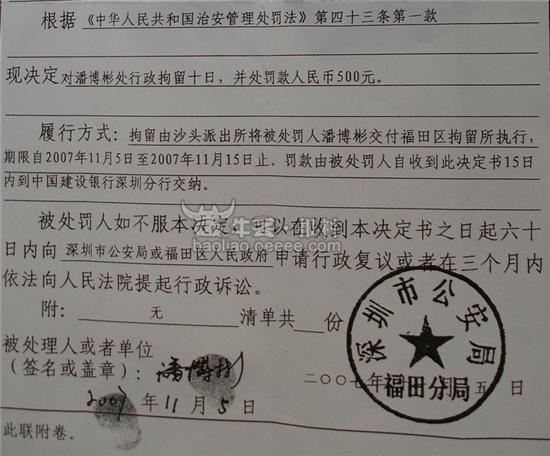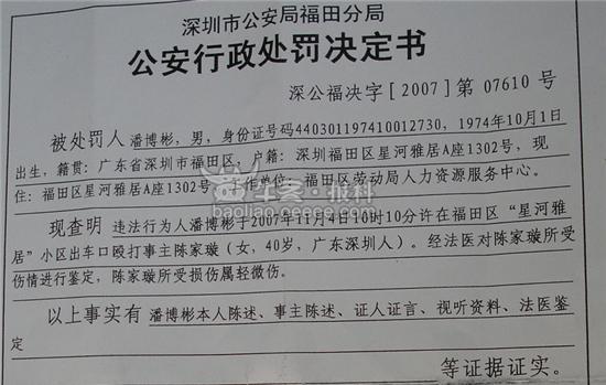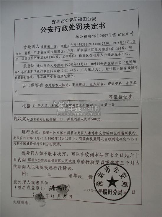 四中乐叔 版主 版主 注册 2006-05-06 消息 6,725 反馈评分 3 点数 61 2007-11-06 #47 深圳市福田区劳动局职工潘博彬打人事件有了最新进展。11月5日晚上23时福田公安分局经过调查取证,对涉嫌殴打他人的潘博彬作出了治安拘留10天并罚款500元的处罚。经鉴定,被打事主陈女士为轻微伤。根据《治安管理处罚法》有关规定,福田警方作出上述处罚。 附件 451b2c51-8add-4009-b2cc-f7f34dfadb09.jpg 37.3 KB · 查看: 359 676f7b7a-2a25-46ca-83e1-c54e888c6707.jpg 43.7 KB · 查看: 393 cf6401ed-6097-4f5e-9689-00662d512fe8.jpg 61.7 KB · 查看: 430