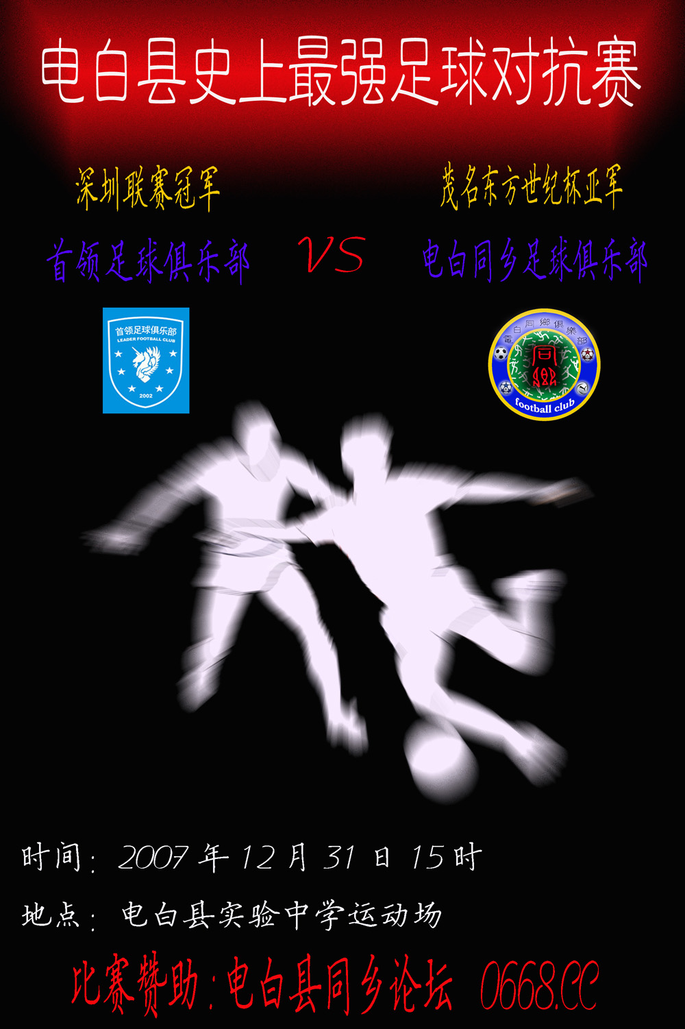 为了迎接2008奥运年的到来和元旦节的到来,更为了提高电白足球运动的水平,活跃当地足球运动的气氛,又在深圳亚牛的热情积极联系下,我们电白同乡足球俱乐部将有机会于2007年12月31日在电白实验中学足球场与深圳联赛冠军首领足球俱乐部进行一场友谊赛。。。希望电白同乡足球俱乐部做好充足的应战准备和广大电白球迷到场观看。。。谢谢!!!