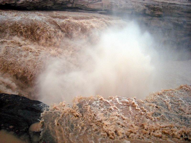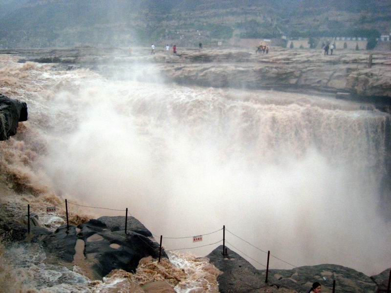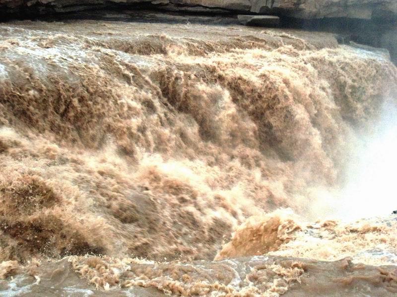 壶口瀑布是水平瀑布,黄河水千百万年来不断的从130多米的水平面聚到壶口只有30米左右这一点前,向下冲涮,形成了向下沉的瀑布。水流激起的水雾,升腾着。