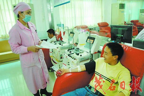 由香港人邓兆健亲自驾车带队的深圳红十字会无偿献血志愿工作者服务队义工团来到我市中心血站,给患白血病的女大学生小倩无偿捐献血小板(如图,记者 甘杨松 摄)。