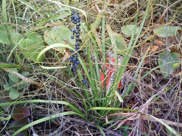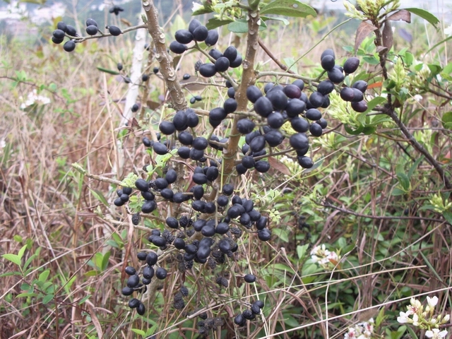 第三棵 电城庄山 长在半山腰偏上段路边,像一株四散的韭菜,中间一根独梗,梗上挂满黑果籽,四周无同株,显得有点独特.