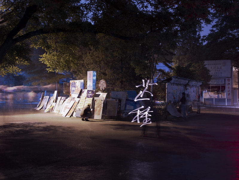 两名电焊工正给这一小块呈三角形状的绿地安装铁栅栏,焊接枪的火花沿着绿地外围,一截截齐整地吞噬前方一道约5公分深的泥沟。这里可能会出现一个电子公告牌。“三角地”北侧的百年大讲堂,巨型电子幕墙显示,距奥运会开幕还有278天。西侧的新华书店,两名店员好奇地探头张望,来往赶早自习的学生,在电火光的烟雾与滋滋声中,下意识加快脚步。
