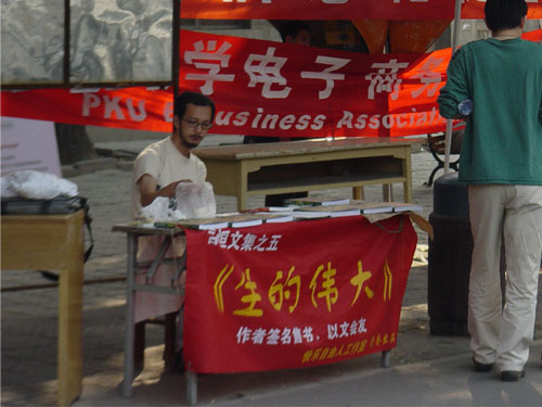 当时网络尚未普及,学生日常生活中的信息来源,大部分都要从三角地获得,其中当然少不了买卖自行车、租房、转让物品等广告。不过那时三角地的主角仍然是各种讲座以及各个社团的宣传海报,只要在上面注明“保留几日,请勿覆盖”,一般都能得到尊重。为了一张海报,几个人蹲在地上满头大汗地又写又画,是当时宿舍里常见的景象,所以学生中也特多书法美术高手。每天下课经过三角地,总要挤在人丛中看看海报,了解一下今晚有什么讲座,心中盘算着听哪一场好。在看海报,听讲座,参加社团活动的过程中,往往会找到适合自己发展的领域,结识志趣相投的朋友,逐渐形成属于自己的“圈子”。因此,那时的三角地是名符其实的北大生活的中心,多数人的大学生活都是从这里开始的。说三角地是民主的象征,在我看来未免空泛,不如说它是北大校园文化的温床。它作为一个平台,将思想的火花汇聚到一起,把平日各行其是的北大人联系起来,从而形成一种氛围,一种生活方式。这一独特的校园文化,才是维系北大生命常新的鲜活血液。