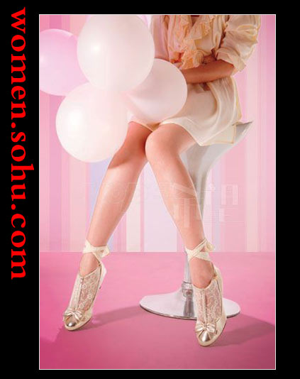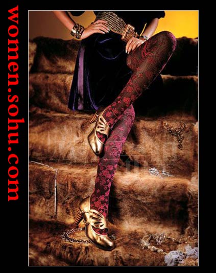 明亮的金属色高跟鞋配衬洛可可式紫色镂花连身袜,刚柔调和,既彰显个性,又华而不俗,高贵而不高调。