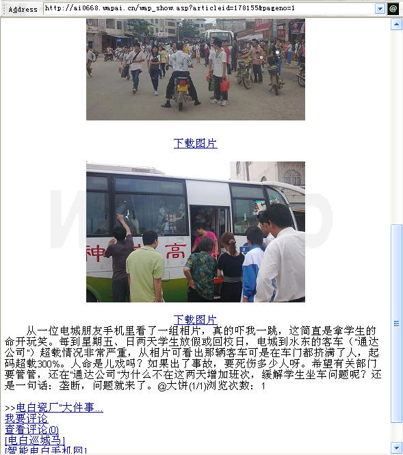 每到星期五、日两天学生放假或回校日,电城到水东的客车(“通达公司”)超载情况非常严重,从相片可看出那辆客车可是在车门都挤满了人,起码超载300%。人命是儿戏吗?如果出了事故,要死伤多少人呀。希望有关部门要管管,还在“通达公司”为什么不在这两天增加班次,缓解学生坐车问题呢?还是一句话:垄断,问题就来了。