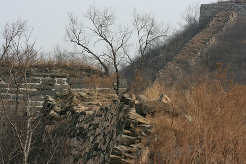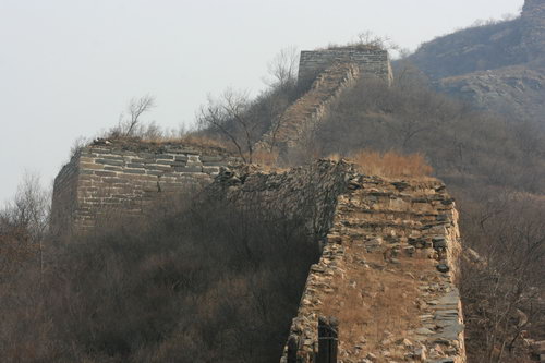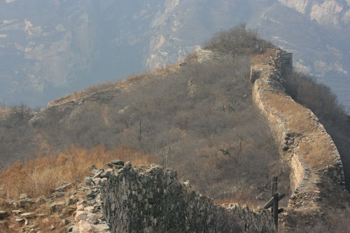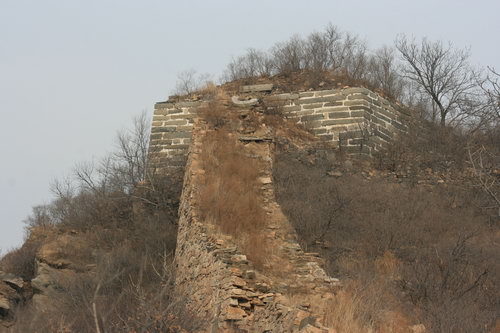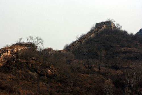 2008年12月27日周六,虽是冬日,风和日丽。我一人驱车再次前往北京密云石城镇,到黑龙潭右转向东行,过河,上山,停车,拿起相机,既走向山上的野长城。荒野无人,就我独自山中慢步,行至半山谷,无路,在树林中穿行,到长城,爬上城墙,走过三个烽火台,下山,无路。来回全程约五个小时。