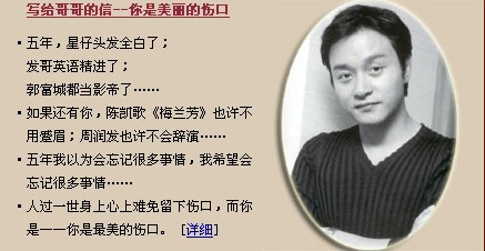 小 小小兵 幼儿园 注册 2009-02-10 消息 7 反馈评分 0 点数 0 2009-04-01 #24 [attachmentid=210764]绝代芳华,如银河中星星般灿烂。永远怀念你“哥哥”。 附件 2009331205311.jpg 68.8 KB · 查看: 365