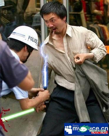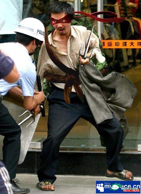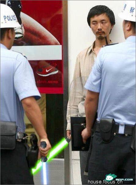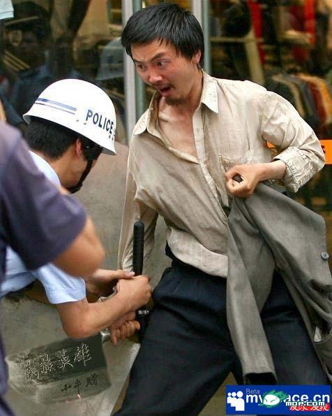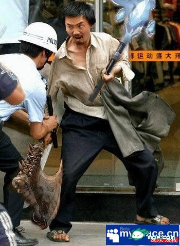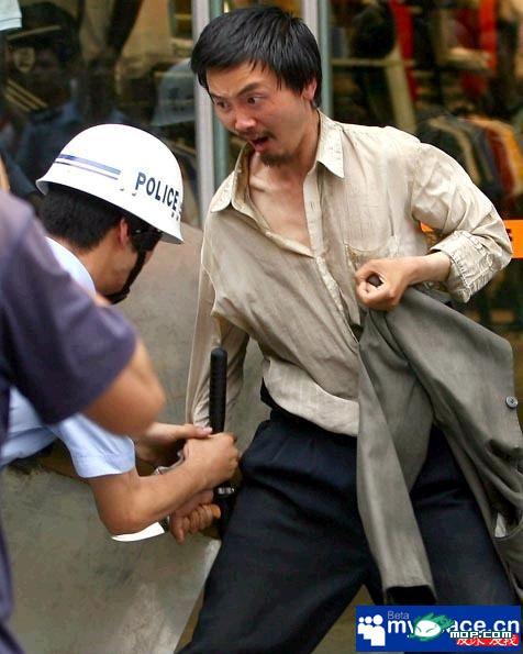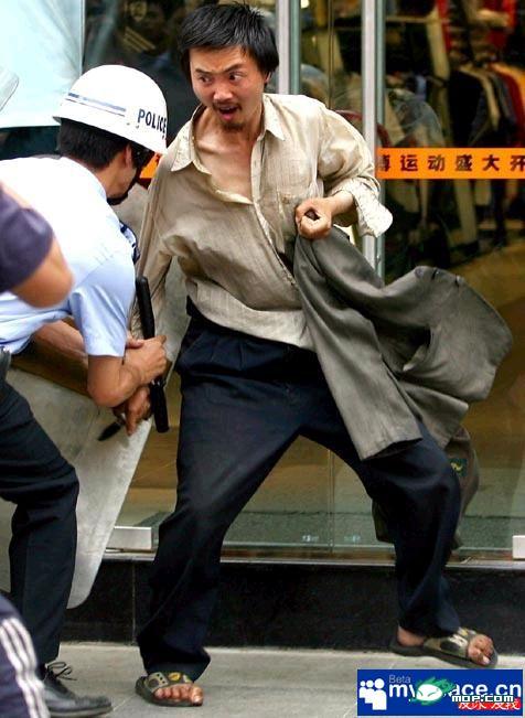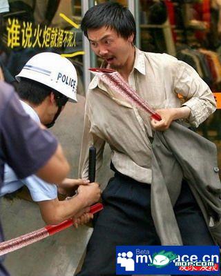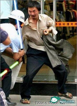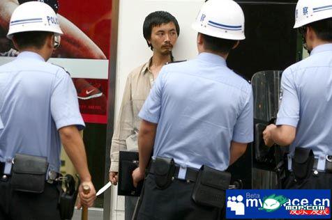 围观的群众越来越多,现场气愤十分紧张。"往后退!"警方扩大警戒线范围。现场群众注意到,参加抓捕的20余名警察中有6名手持一把拖把、4名提着盾牌、1名背后藏一根木帮......无枪影。他们成弧字型的将"刀客"围起来。"好搞笑哟!警察抓人用拖把!"微观群众七嘴八舌,议论纷纷。