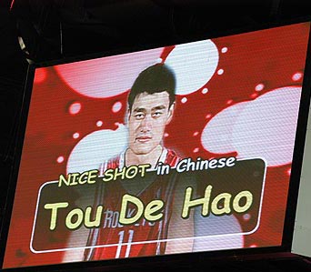 (screen.width*0.8-200)) this.width=(screen.width*0.8-200)'>图为比赛间歇球场大屏幕上播出姚明教球迷用中文念“投得好”的镜头