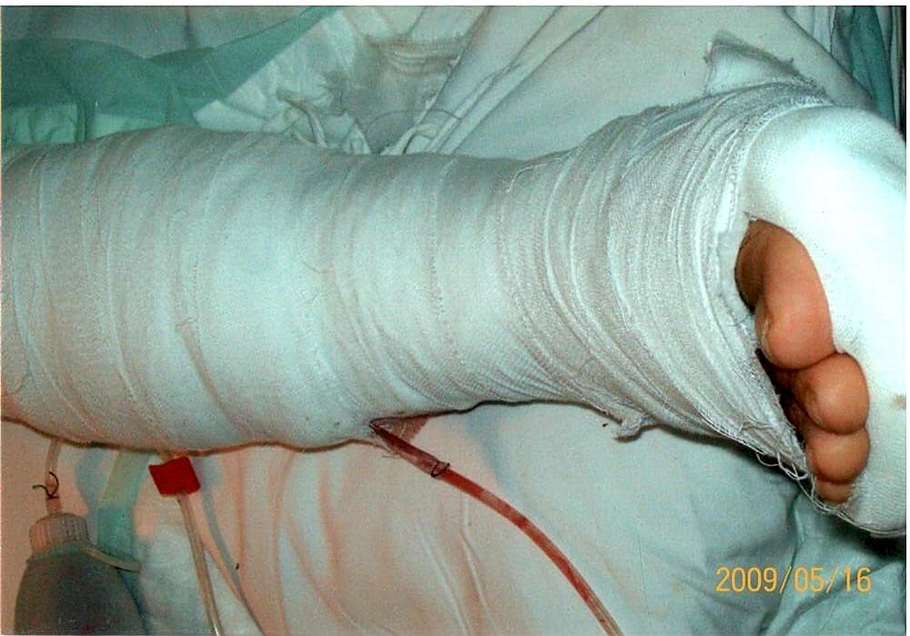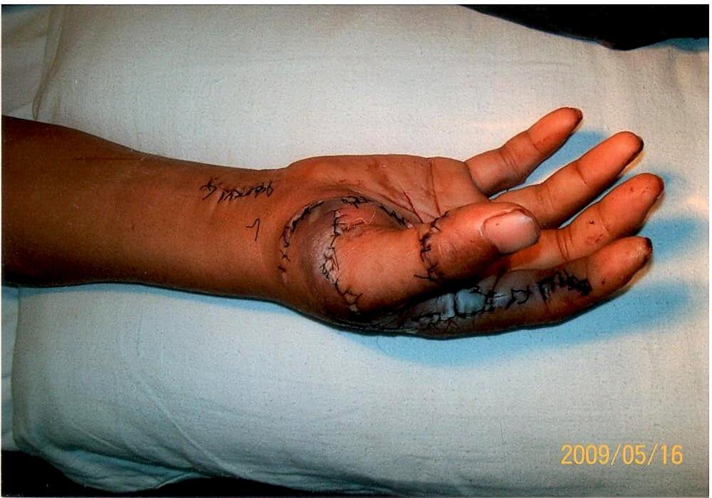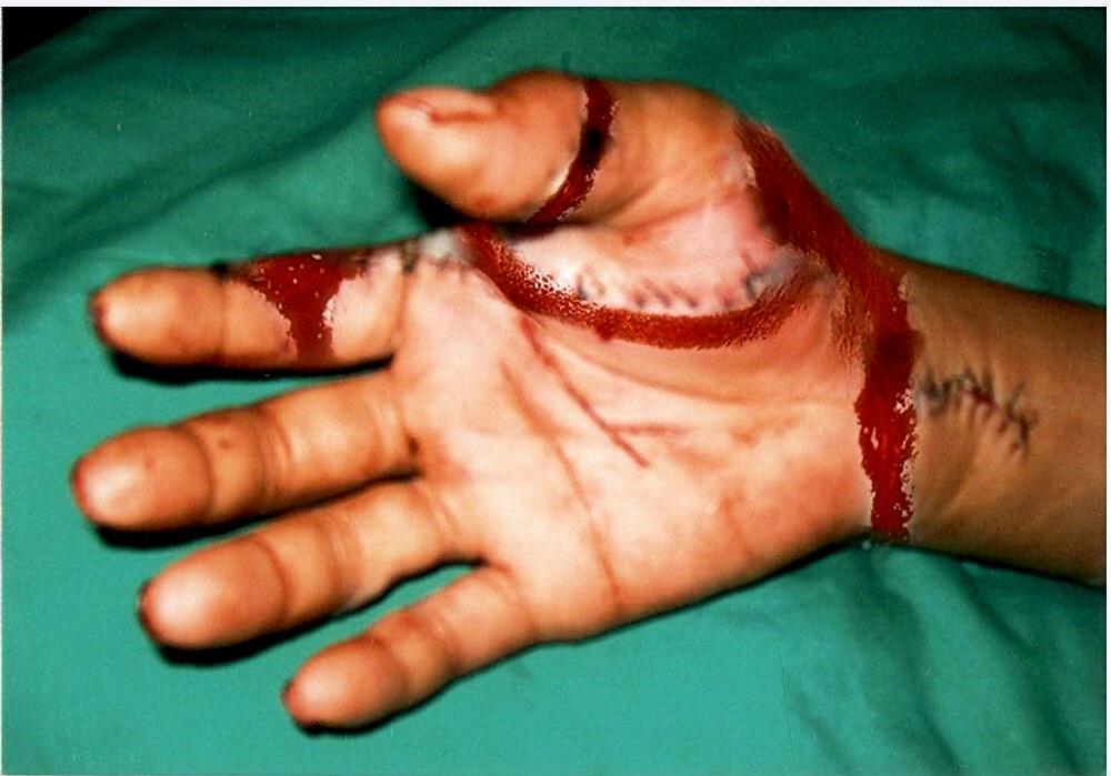 陀枪带刀,趁我不注意,向我袭击,把我的双手双脚砍断,鲜血淋淋,我当场晕倒。凶手逃跑了!