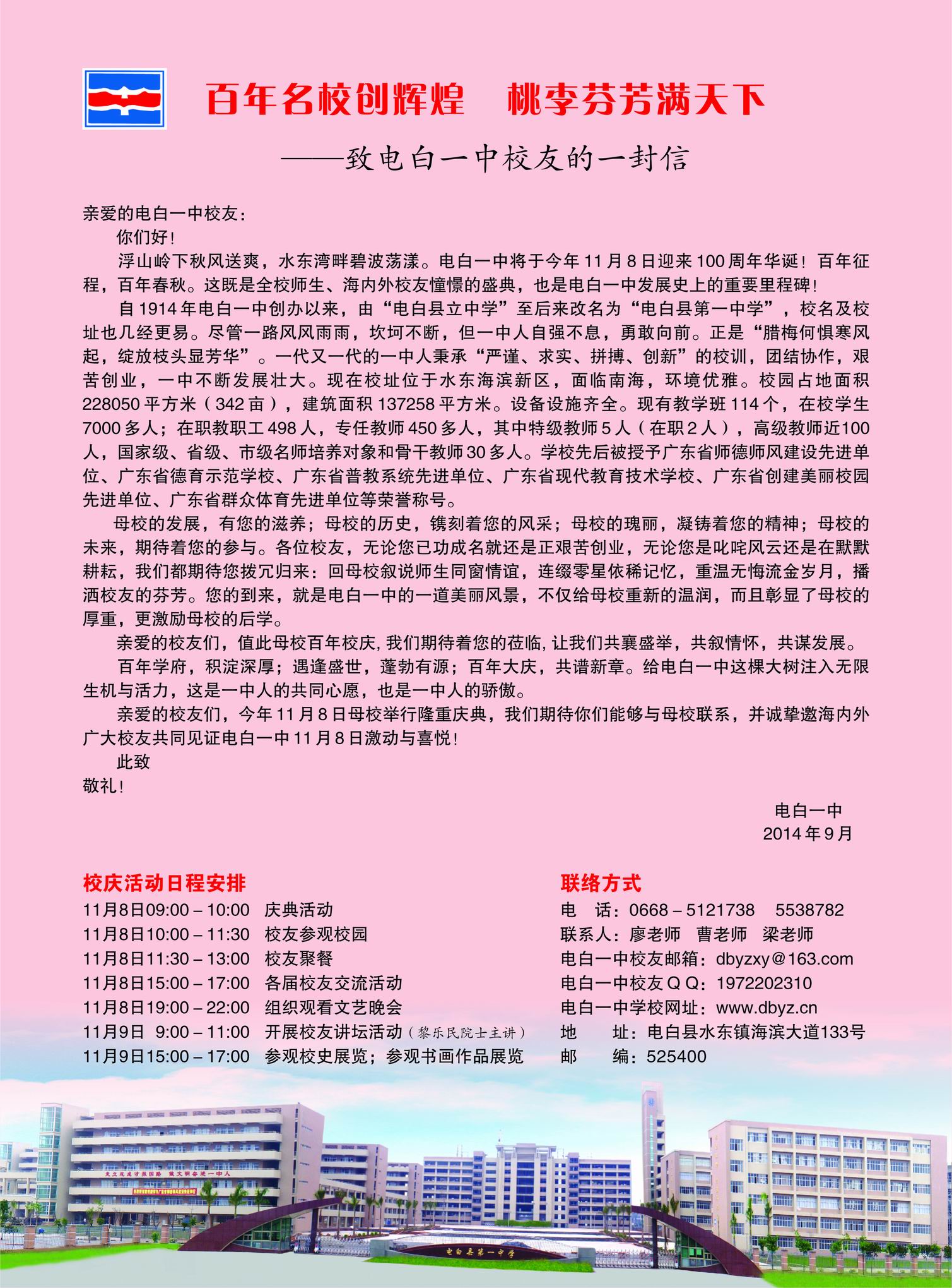 近接通知,电白一中建校一百周年校庆,历届每班只限三人参加。 试问:是否怕校友众多,校区容不下,禁止全面通知,只搞小圈子校庆? 我想,组织者一定是认为自电白一中建校起的第一届毕业生至二0一四级新生都回来参加了,不然怎会禁止学生回母校参加校庆?我想,文革时期毕业能回来的都少了,何况一百年前出生的学生! 纵观各地学校的校庆,都在报纸广而告之,让学友有机会回母校一聚,看看母校的发展。 历届毕业生,藏龙卧虎,一些有志为母校建设、发展的学子,由于没接到邀请,势必伤心! 电白一中的校庆,真让人伤透了心。