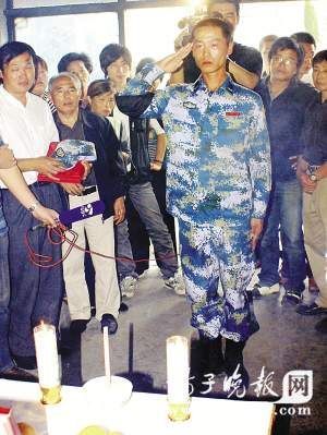 看得出来,在父亲遗体前,王震似乎有好多话要说,而此时他只能望着爸爸那张熟悉可亲的脸庞,一动不动地在流泪。绕着爸爸遗体一周后,王震给爸爸磕了几个响头,然后用从阅兵村训练出来的最优美的军人站姿,向爸爸敬了一个标准的军礼,久久都不肯放下。杨副政委也代表岸舰导弹方队送来了花圈。