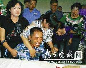捧着爸爸的遗像,王震一路哭泣,步行来到设在大丰敬老院的灵堂。一进大门,王震直奔父亲的遗体,大哭之际放声呼喊:“爸爸,我回来了,你怎么躺在这里!”一声伤心的呼喊,让在场所有人无不为之动容,现场顿时一片抽泣声。伏在爸爸的遗体旁,王震泣不成声,此时,他多么想像以前一样去拉老爸的手,去拍拍老爸的肩膀,但此时,老爸的脸被撞之后已经变形,且冰冻了57天,他不敢也不愿再去伤害老爸,只是在爸爸的遗体旁失声痛哭。