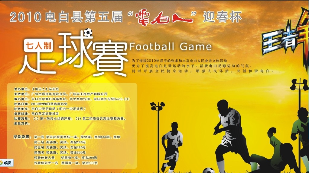 2010年电白县第五届《电白人》迎春杯七人足球比赛正式报名啦! 本届比赛拟定16支参赛球队,主办方《电白人》杂志社赞助所有参赛球队球服。前来报名的球队(每队12X2套,主办方拥有球服的独家冠名权),请写上参赛球员的球衣大小和号码。 比赛章程很快就出来,请留意。 报名地址:华龙数码快印 水东新风街新风苑17号 电话:5507576