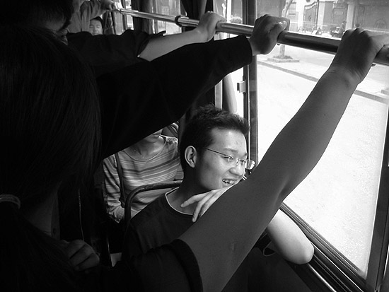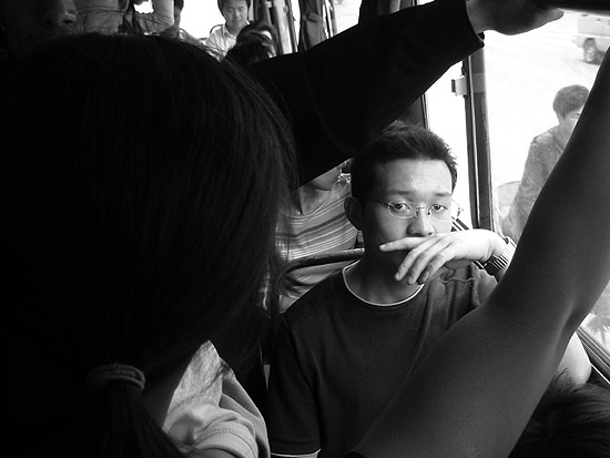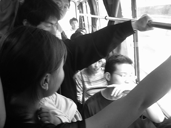 车厢内比较挤,一个抱小孩的妇人,站在一个男青年的座位边上,孩子大概还不满周岁