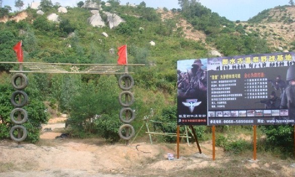 电白御水古温泉位于电白县麻岗镇境内,325国道与广湛高速之间。温泉十分丰富,不断喷涌,水温高达80℃,属含硅、氡、氟的高温温泉。自秦始皇署郡开始,热水温泉已是一个名扬遐尔的旅游区,到了清代末期,列强入侵,温泉逐渐衰落,但仍保留着历代文人墨客的诗碑、石刻和名胜古迹。我们野战基地位于度假村内,占地约4000平方米,场内军事设施完整,建有大型碉堡和防御工事,场内南面是丛林战区,各种植物生长茂密,适合开展多种战役的攻防和战术安排,是目前茂名野战活动阵地战和丛林战不可多得的经典战场。