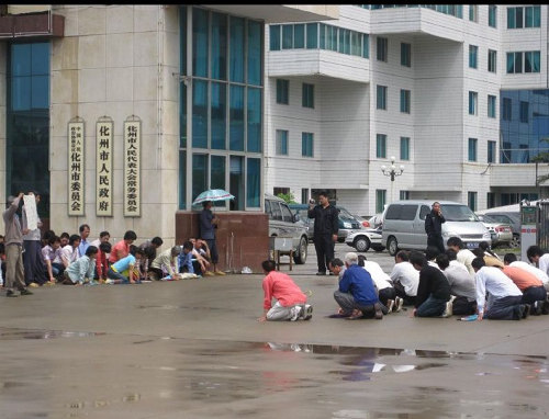 经过3个多小时的行程,村民终于来到化州市政府门前,举着横幅要求约见市主要负责人。由于没人理会,数十个村民便在市府门口两旁跪了下来,其中7个披着“冤”字白衣的村民跪在最前面。当时,天正下着雨,场面显得异常悲惨。