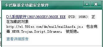 而前面楼主发上去的网址只要一打开,杀毒软件就出现了报毒现象,现在基本可以确定这是网页木马,而且确信没有安装杀毒软件的电脑,基本已经中毒!!!!! 建议大家立即下载杀毒软件进行杀毒!