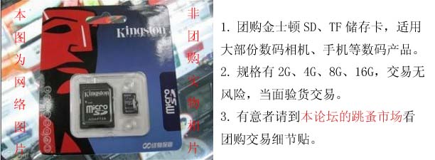 团购2G、4G、8G的卡不收取定金,当面交易,所以不存在被骗风险。16G卡因为价格高,本人负担不了,如果确实要买需收取少量的保证金。因本人不是做生意的,团购也不收取定金,为防有人恶意参与,所以一个论坛ID加手机号只能购买一张卡(具体视情况定)。