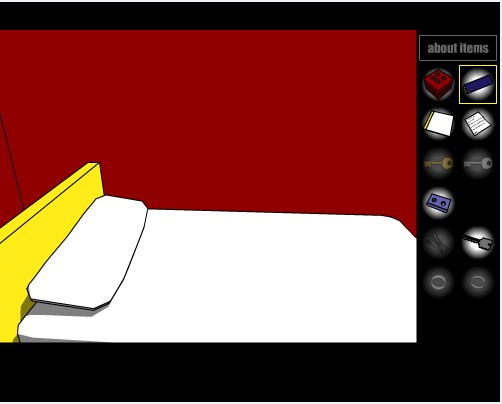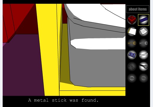 4。点地上的红毯子,骷髅!!点击靠近,在左手手腕处发现钥匙,右手发现药瓶,点小腿处的红绳物体可以把毯子叠起,并发现脚上有密码锁,(暂时不开),点物品栏中的红毯,再点下边的“查看物体”(即"About Item"),可放大,点大图的红毯子得到十字架状物体: