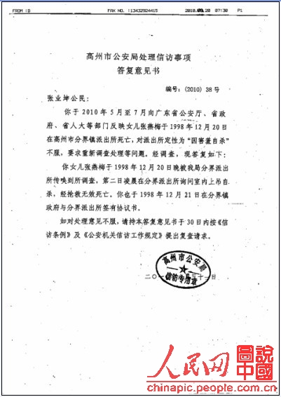 就在我女儿被抓进派出所的第二天,即1998年12月21日中午,分界镇派出所所长刘亮奇(男,时年43岁,汉族,党员)就派4个人开车到我家里来,他们通知我去分界镇政府一趟。当时,我和我老伴再三追问原因,也得不到半点的解释。他们见我迟迟不肯动身,几个人前推后搡地强行将我拖进车里。我满腹疑问地来到了分界镇政府,坐在书记办公室等了大约半个多小时。随后,分界镇政府监察室的廖书记(廖成全)进来对我说:“你女儿张燕梅昨晚已经在分界镇派出所的询问室内死亡了,今天早上我们已经请两市(茂名市、高州市)的公、检、法处理了,法医鉴定结论是‘吊颈自杀’,她是脱了自己的外衣,用外套衣服吊颈自杀的。她是因害羞死亡的!”他说完这些话后,不再多说。