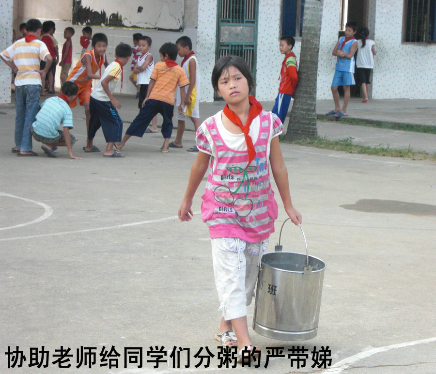 而后我们到严明珍所在学校了解到,严明珍小学毕业的成绩已达到了电海中学(省一级中学)的录取线,因家里经济贫困而没能如愿,加之担心父亲年迈多病无人照料,妹妹尚幼无人照顾,在下海小学学校领导的帮助下,严明珍进入了爵山中学的尖子班并争取了一个学期100元的特困生补助,虽是离家最近的一所中学,但严明珍也是该学校离家最远的一名学生,每天她需花费两个多小时,骑着自行车来回20公里上学,因所住地离学校较远而没能参加晚自修,晚上回去还要在理发店帮忙,安排自修复习的时间因此减少,成绩有所下滑,感觉很是吃力。言谈中,明珍对学习抱有强烈的愿望,对自己的成绩下滑充满无奈与深具无助感,她希望能有更多的时间投入到学习中去。妹妹严带娣,下海小学领导为其免除了所有的书杂费才得以继续上学,同时懂事的带娣,为感激学校免费为其提供的早餐,她在学校每天都会主动协助老师给同学们分配早餐。