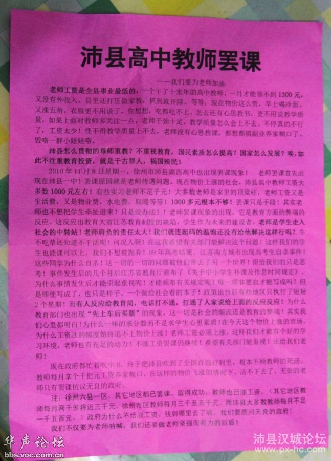 惊闻近期县城中小学又出现罢课的事件,感觉到心情非常的沉重。 教师罢课,这是我们最不愿意看到的一幕,自古以来,秀才造反少之又少,然而现实就发生在我们物华天宝、人杰地灵、贪官辈出的赣榆大地上,究其原因,很值得我们去深思。 据说这次教师罢课的导火线是由讥笑工资所引起的,市级学校在本次工资中,每位教师可以加到1-2千多元,而4县学校的教师只能加1-2百元,而4县教师工资与本地公务员来对比又存在不少的差距,有道是“不患贫患不公”,另外还听说今后校长、局长等领导的年终奖将从老师工资的百分之三十里发,因为讥笑工资调整的悬殊,引起了教师们对政府的不满,从而进一步引爆了罢课这个炸药桶。 从事件的起因来看,我觉得本次事件既不是一件政治事件,也不是一件群众事件,至多是一次教师自发的一种维权行为。没必要去拿它来上纲上线,虽然教师们的做法稍稍有点过头,但绝不能像有些同志说的那样:“全部追究责任,严重的死啦死啦的”,如果是这样的话,我看中国的民主政治永远是不可能实现了。事件既然发生了,我认为接下来就是政府如何去面对该事件的问题了,是强硬镇压呢?还是坦然面对,科学论证,听取民意,协商解决。 教师工作确实是一种非常辛苦的工作,有一首顺口溜讲得好:教师是什么?起得比鸡还早,睡得比狗还晚,吃得比猪还差。这种说法虽然有点夸张,但实际看来也差不了多少,据说现代社会两种工作是风险性最大的,一是医生,另一种就是教师,尤其是中小学教师,工作压力是非常大的,每位教师要面对七八十位学生,而现在的学生绝非善辈,个性十足,管教起来十分辛苦,言重了怕他(她)跳楼跳河,不管吗?家长们又有意见。教得好,别人也不见得说你行,教得不好呢,又有来自上级部门的压力。总之,教师是被压在社会最底层的弱势群体,古时还说教师是“臭老九”,现在教师的地位绝对不是第九了! 教师也是人,也要成家立业,娶妻生子。打个比方,同在一片蓝天下,大家一起去市场买青菜,不可能市场上对每位市直教师或公务员们要卖到3元每斤,而对4县普通教师只卖8角一斤,如果是这样的话,我相信我县教师们绝对不可能有意见。自古以来,教师付出劳动,获得报酬是天经地义的事情,据说我们教育界的鼻祖孔老夫子,在教育学生时还要索取几块腊肉,更何况我县教师这群凡夫俗子。 教师是太阳底下最神圣的职业,学高为师,身正为范,教师是蜡烛,燃烧了自己,照亮了别人……如果这一切是建立在社会的不公正之上呢?一切还有意义吗? 我个人认为:如果本次事件没有真正地从根源上加以解决的话,我看教师们的情绪一定难以平服,这样必定严重损害我们赣榆的教育事业。假如所有的或大部分教师都去从事第二职业,或者开班办学,或是在教学时出工不出力,消极怠工,这将揭开我们赣榆教育历史上最黑暗的一页了,届时,我们的子孙后代还有希望吗? 我不太清楚为什么这次老师的罢工会引起那么多人的反感,有那么多的人跳出来恶意的攻击甚至谩骂,不说那些贪官污吏,职能部门,特殊行业,金融机构,你问问在街上乱停乱摆的,摩托非法运营的,他们不仅仅影响了城区交通,影响了市容,还偷漏了多少国家税收,可有多少人对他们的抨击有老师强烈! 想到前一次的一中老师、实验中学老师、海头中学老师因反对“敬爱的孙书记”对这些公办学校改制而进行的罢课了吗?为什么你们没有跳出来呢?是不是也牵扯到你们的利益了呢?因为一旦改制,县城地区学生的学费等必然大幅提高! 能把这群手无缚鸡之力、胆小怕事的秀才逼反的事肯定有其不合理之处,而秀才们可能也许真的是没有别的法子了,你想想看,如果按照正常的渠道走,在物华天宝、人杰地灵、贪官辈出的赣榆能走得通吗?还有就是老师们从罢工中尝到了甜头,例如远的重庆的教师罢工、近的就是上次一中的教师罢工。 所以,我们是不是应该用一种平常的心态来看待这次教师罢工呢! 相信我们现在的政府一定有能力妥善、合理的解决这次矛盾! 让我们少一些争吵,多一份宽容,拭目以待我们的政府里的公仆们的作为吧! 希望你也是用一颗平常心来看我的唠叨! 多谢!
