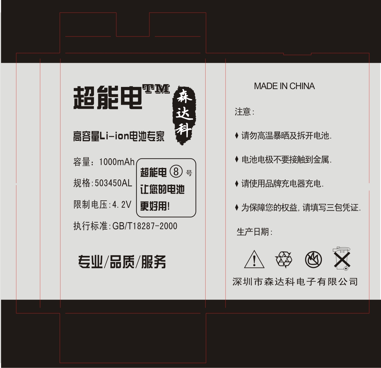 3,“超能电”万能排线电池、电芯,由深圳森达科荣誉出品,选用鸿德、比克、天贸电芯+进口IC+优质排线制作,安全性高,型号齐,专为国产手机赔好电池而努力,真正好质量! 是一家集研发、生产和销售于一体的高新科技企业,公司主要产品:手机电池、电芯、数码摄像机电池,移动电源,等小型动力电池。