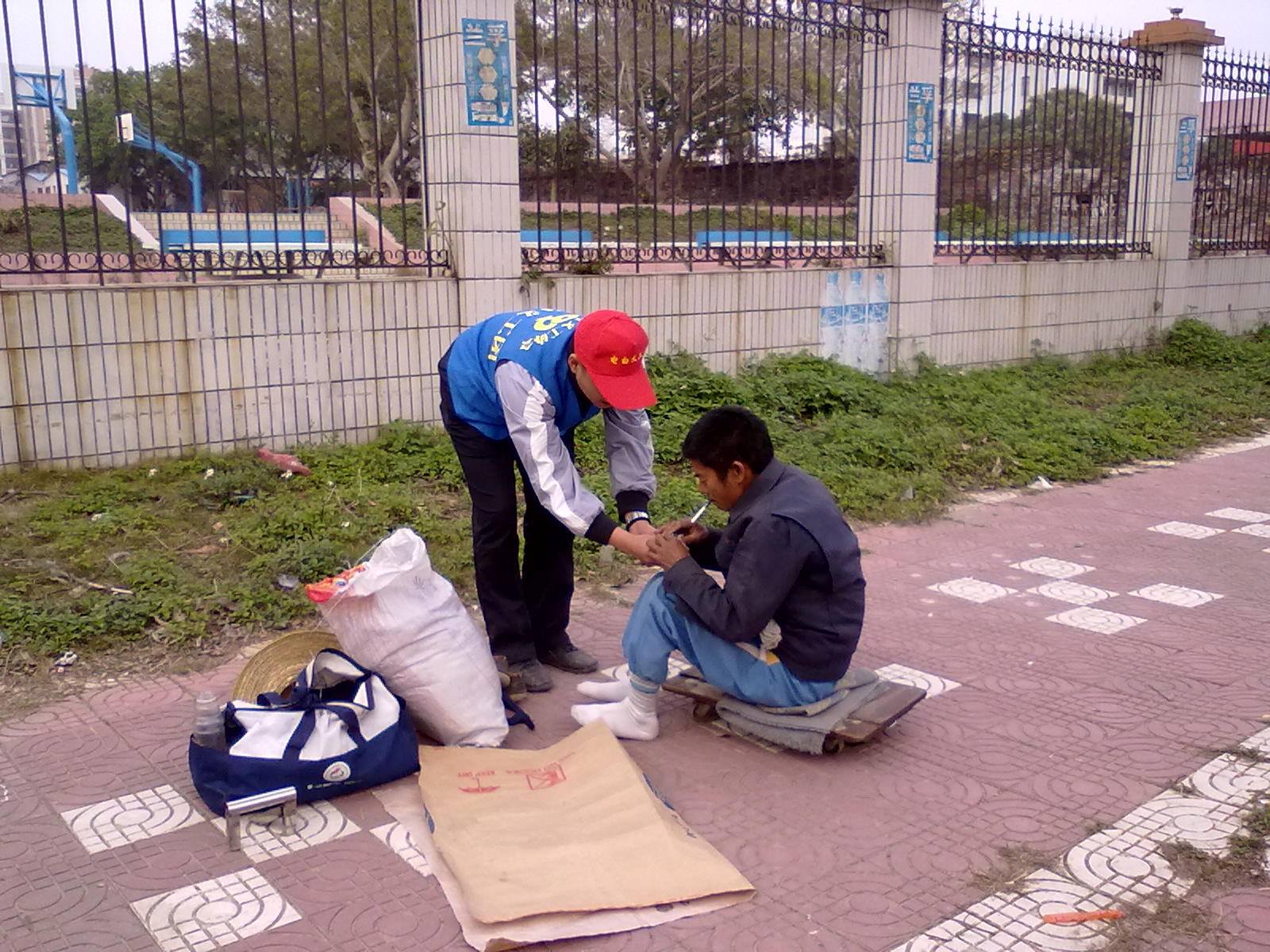 今天下午我们义工团已经找到了他,在与他交谈的时候,他很抗拒陌生人,什么都不肯和我们说,只知道他是湛江人!我们也送了棉被和棉衣过去给他了!!