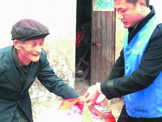 义工为老人送上棉衣棉被。