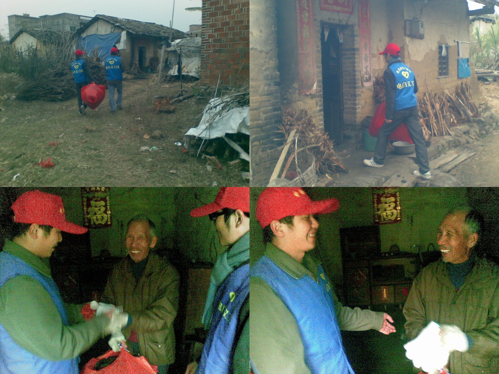 2011年1月13日中午12点,到时李荣林老人家,当时他正在拿着一大盘粥,粥里只有一点萝卜干,这样的场景看着就让人心酸。看到我们来了,他急忙放下盘子,如同见到亲人一样迎了上来,这时义工们把带去的被子、衣服、手套(因为之前去探访老人时看到他的手套已破烂,所以在沙琅市场买了双手套)给了他,为他穿上大衣,放好被子。我们坐下来聊天。过程中他还给我们义工开玩笑说“你们知道明天是什么日子吗?”因为明天是沙琅圩日,每次他都会到市场买菜回来,他给义工们看了昨晚剩余的菜,就只有一点点猪肉和青菜,他说这就是今天的菜了!看着都心酸。