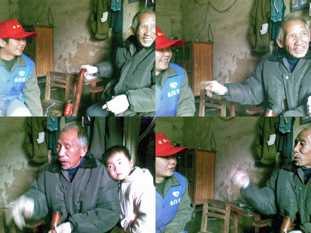 在继续探访其他困苦老人情况时,义工们还发现了一家情况特别“严重”的特困户。这一家或许并不算一个真正意义上的家,三兄弟是这个家庭的所有成员。老大七十多岁了,须发早白。但老天并不让他安享晚年,而是要独自照顾两个半身不遂的弟弟。虽然三兄弟别无所求,但义工们还是强忍着心酸,跑到镇上去为他们买了三张棉被和三套棉衣。