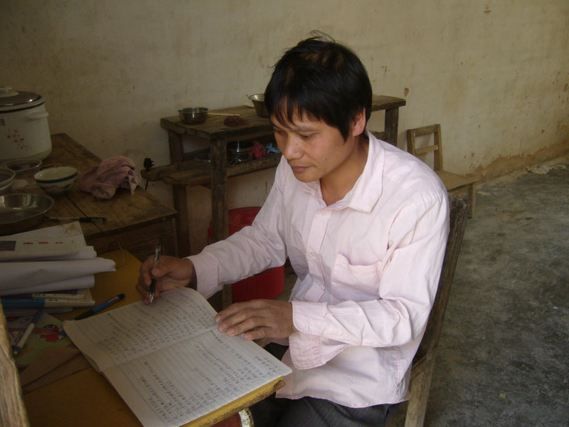 前段时间,我们电白义工团在下乡走访中,就初步认识了这位代课老师李就。他坐在昏暗的房间里静静地给孩子批改作业。见到我们来了的时候一脸惊讶,就在我们介绍完了以后,他就有点激动,然后又安静地回到他的书案边继续完成他的工作――给孩子们批改作业。面对我们要了解的问题,他都很简略地回答了。等他完成了工作以后,我们了解到: