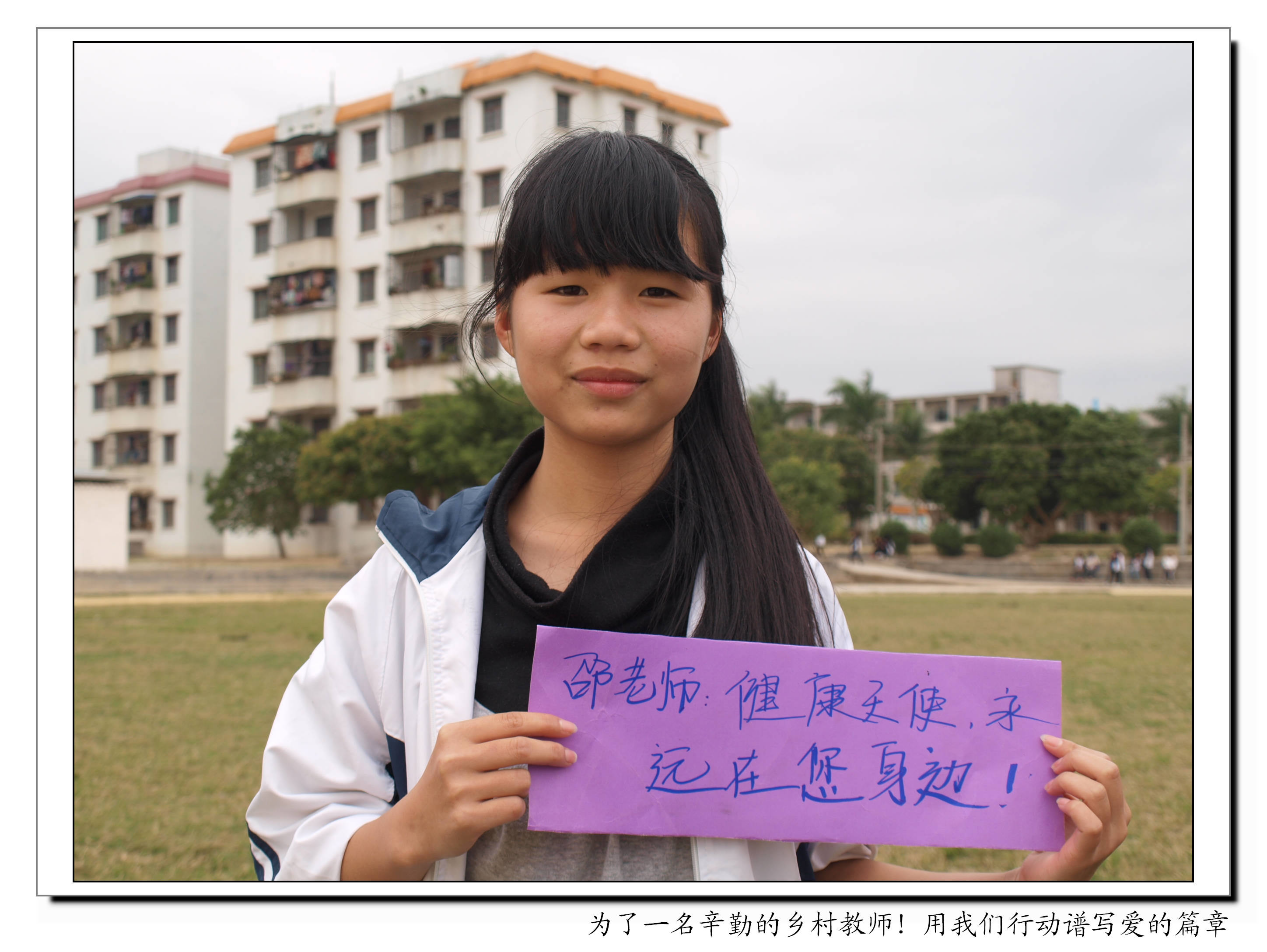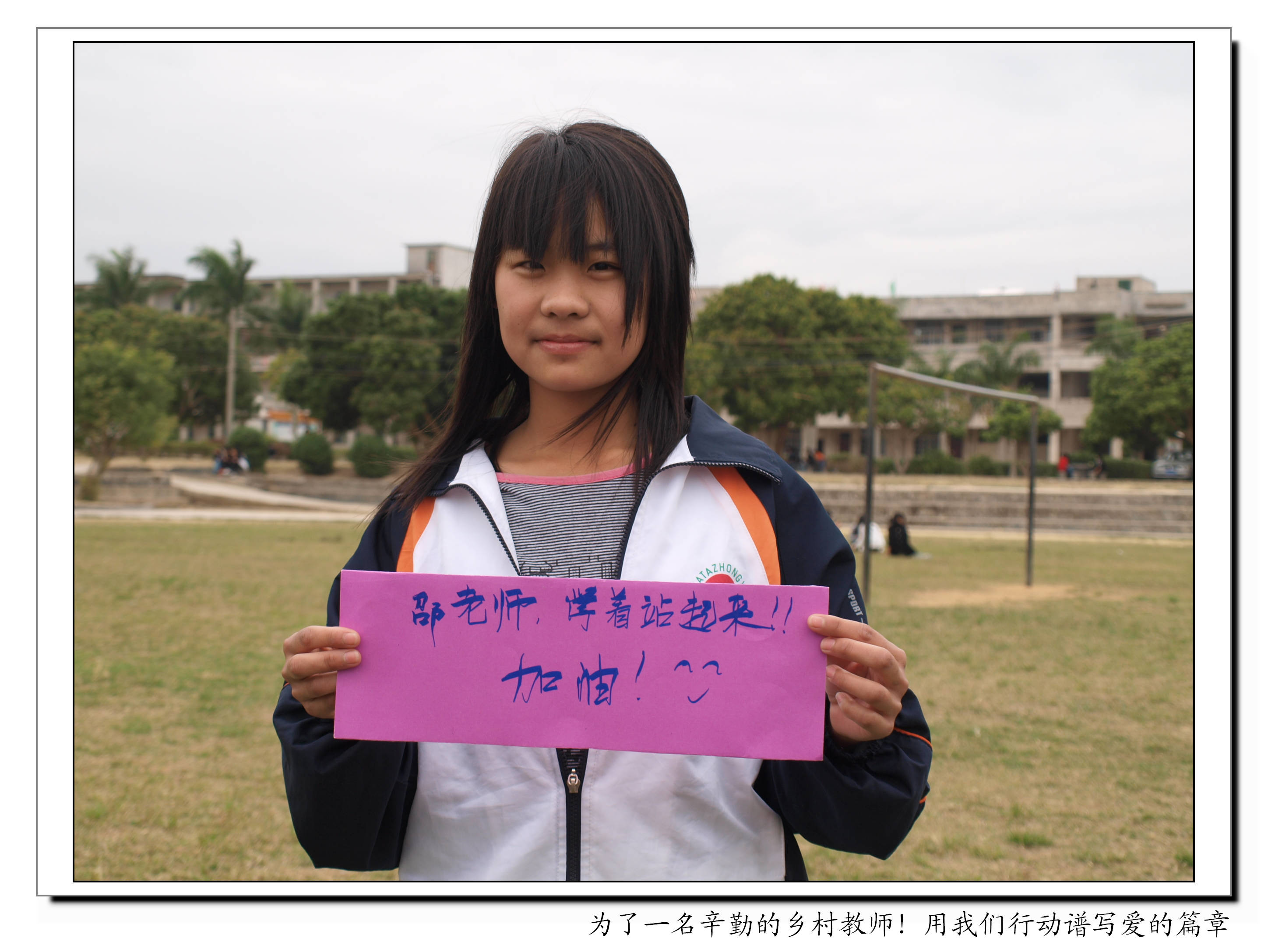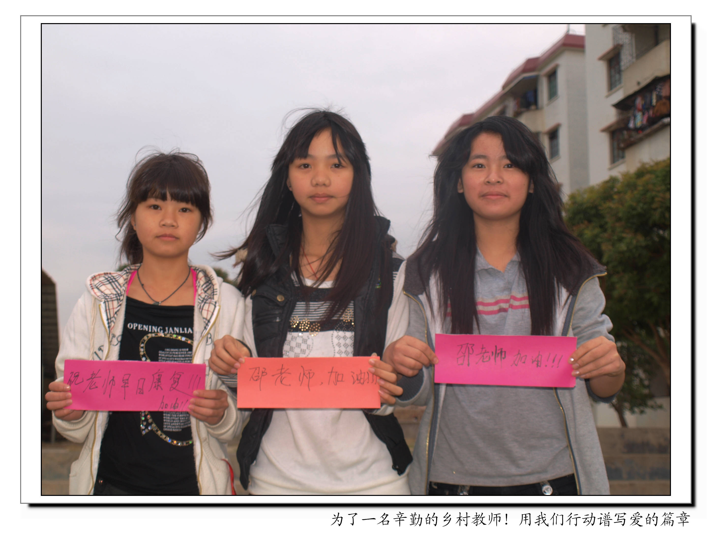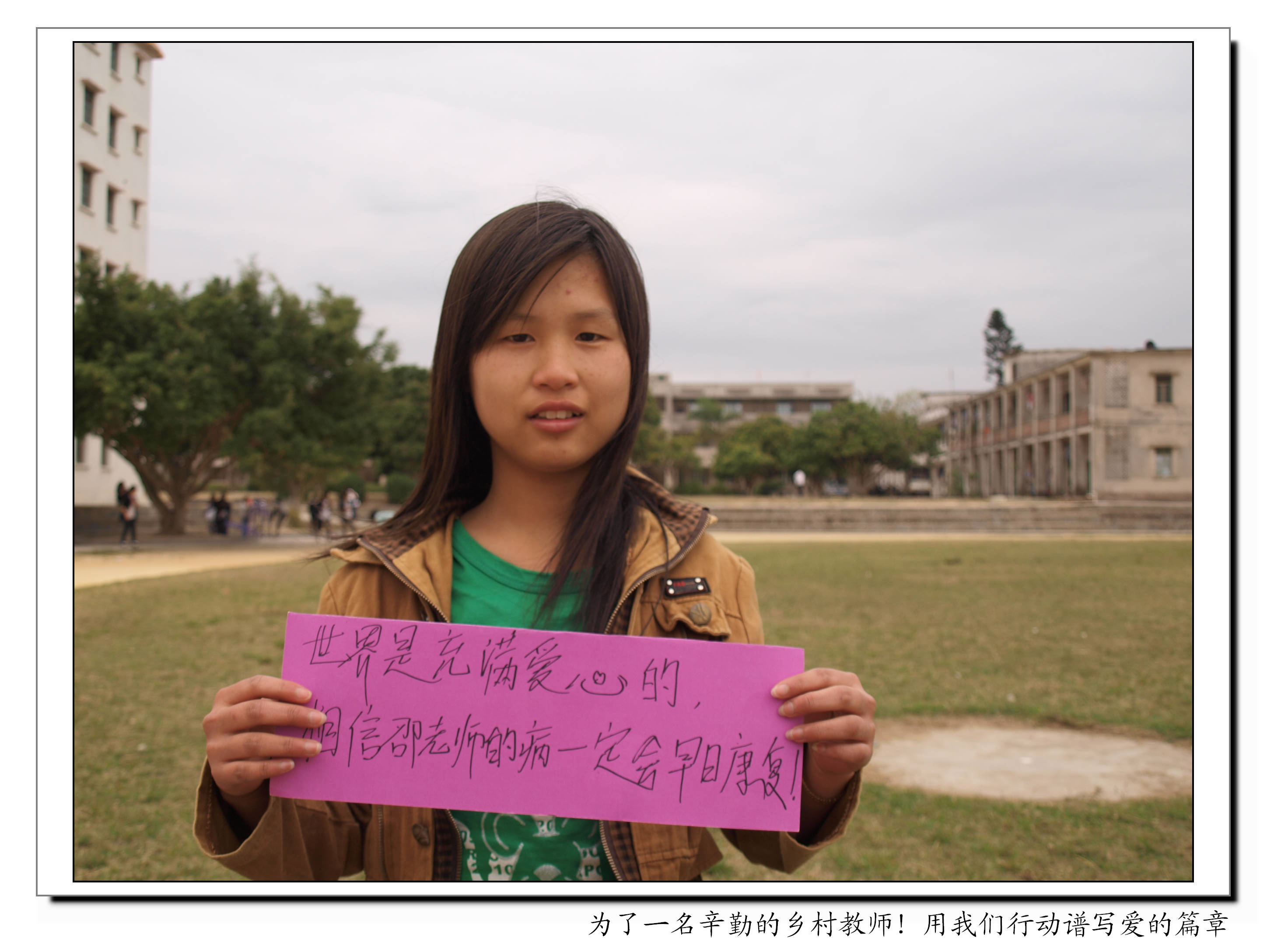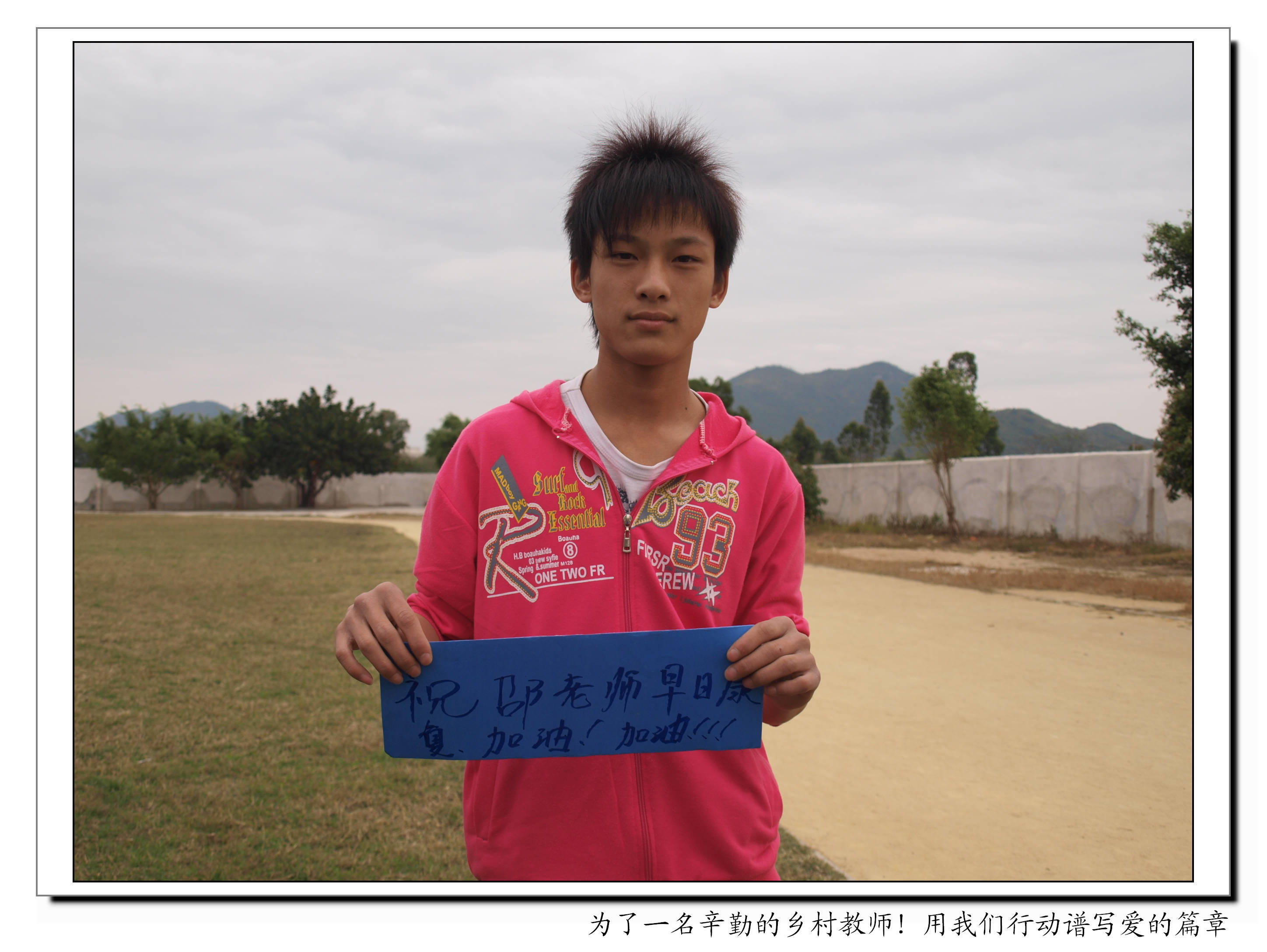 QUOTE(游侠918 @ 2011年03月06日 Sunday, 10:15 AM) 祝邵老师早日康复。好老师人助神佑。 图片上写的字好像同一人手笔,且那些学生表情有点…… [snapback]3108737[/snapback] 卡片上的字都是我写的,卡纸也是自己做的,由于当时有这个让学生拿着祝福语的拍照的想法,所以急着自己做了些,星期五那天自己就带着学生去拍了几张。要说明的是,祈福不是学生自发的,但看到老师这样做的时候,他们也非常踊跃。现在校长获悉了,准备下个星期让团委组织学生一起开展这项爱心活动,我相信不管这个活动形式如何,大家都是很支持的! 还有关于学生拍照的时候的表情,很多同事说跟楼上的一样!可是我觉得支持邵老师,为他打气我们就不要太悲,因为照片的祝福语都是送给邵老师一个人的,让他看到曾经在学校看到那些灿烂可爱的面孔,他会更坚强起来。当然,照片传到论坛上,网友们也会看到会做出各种猜想,不过我觉得孩子的真心的善意超乎了所有不必要的疑虑!