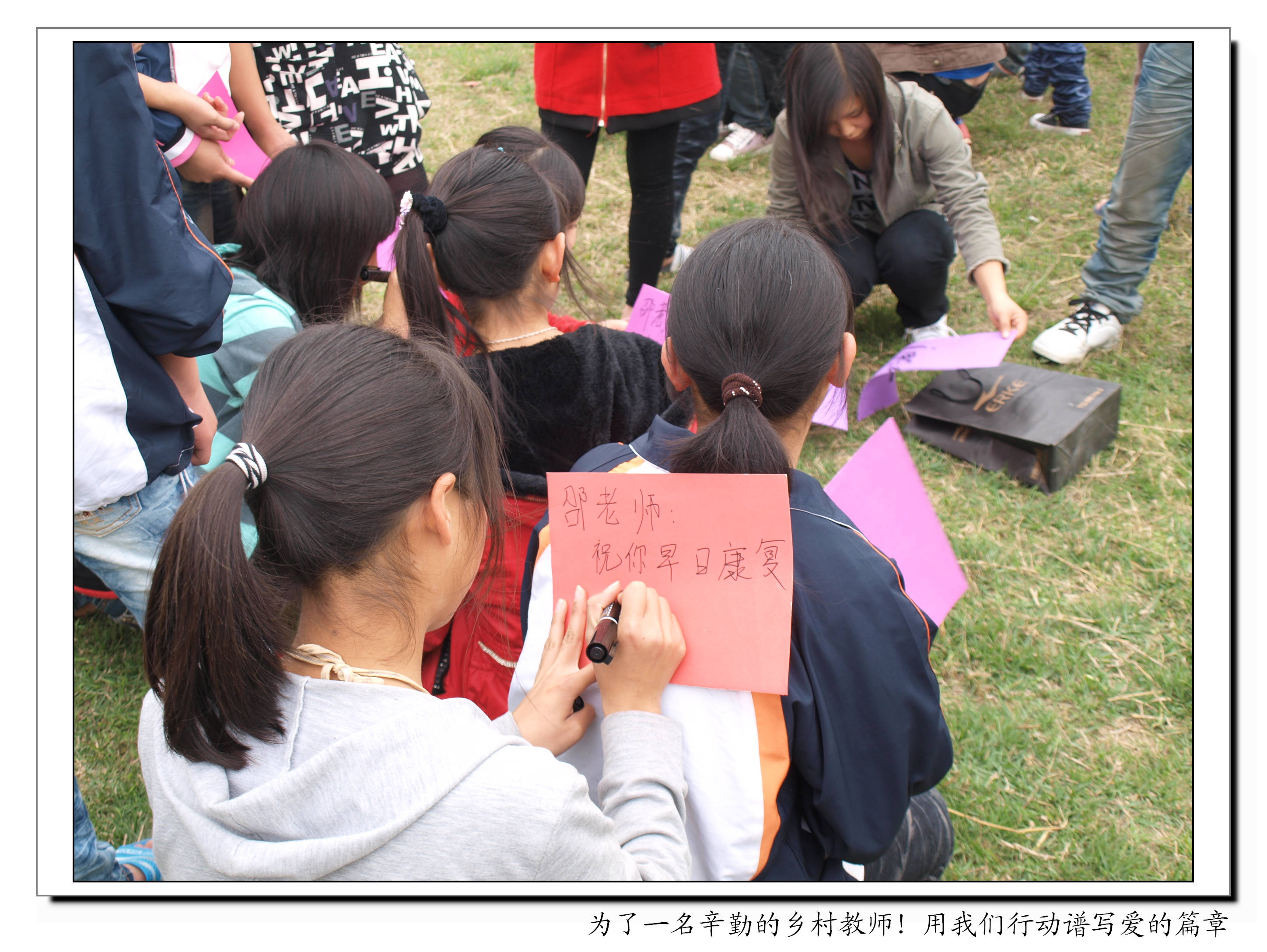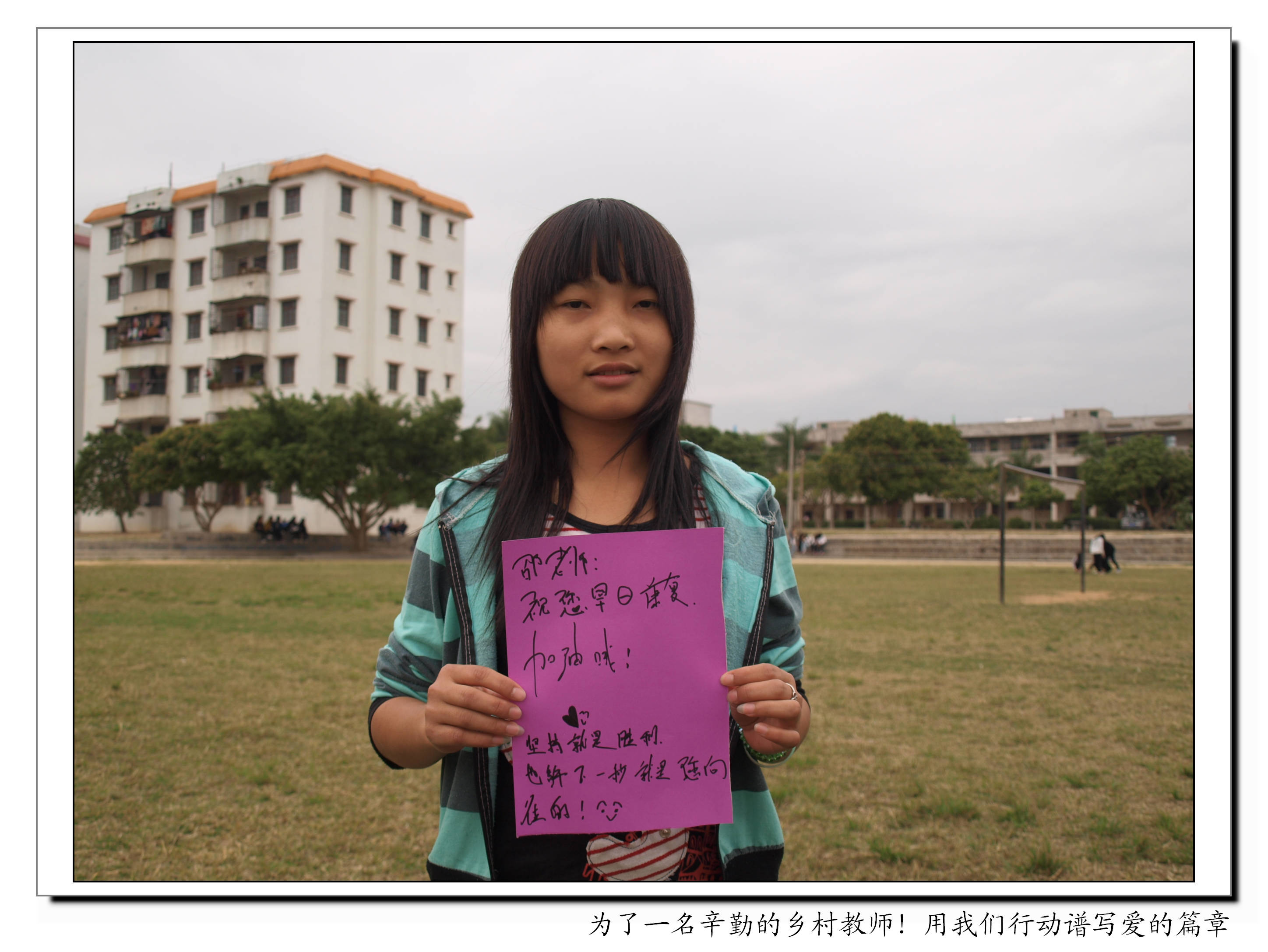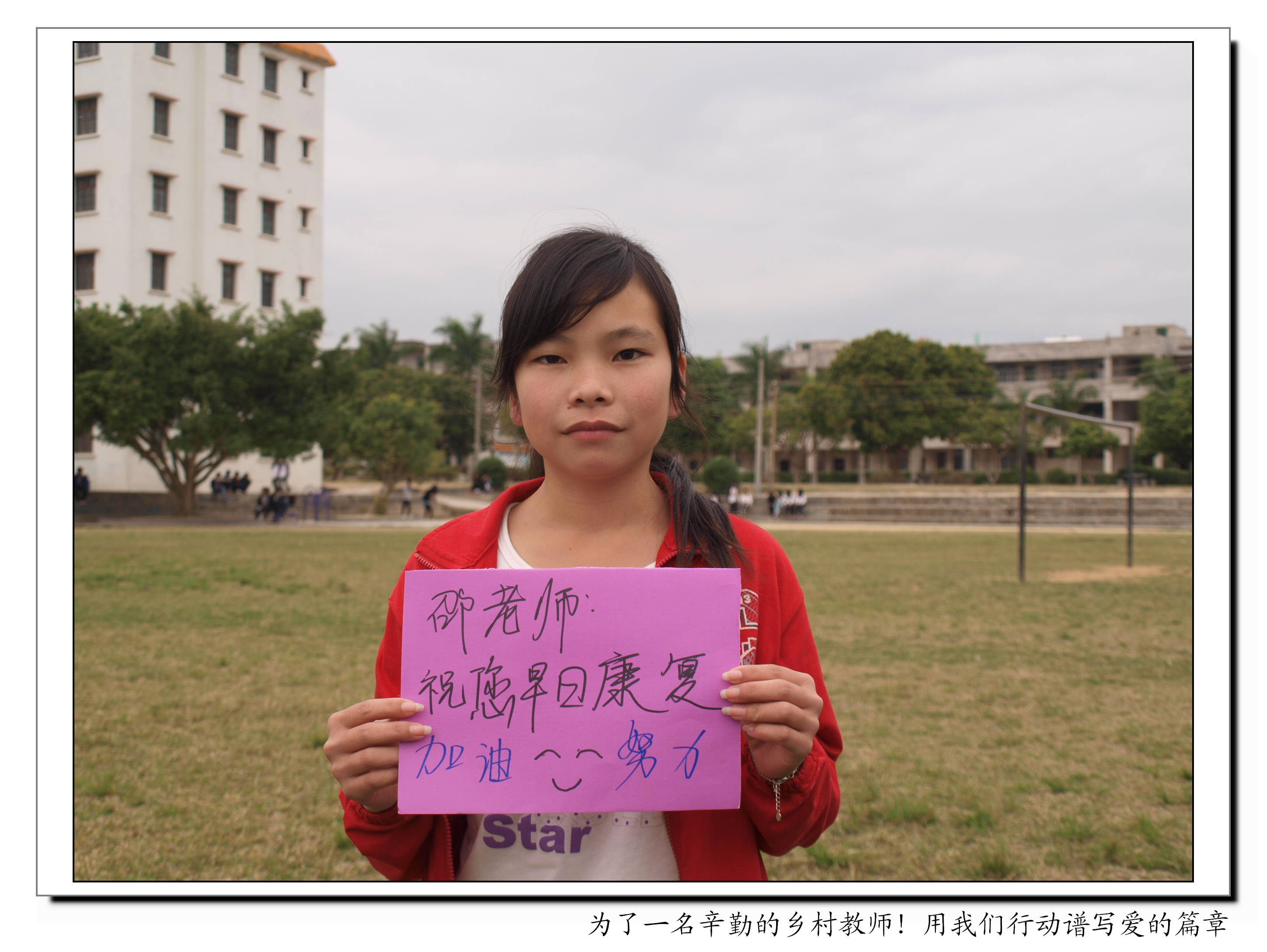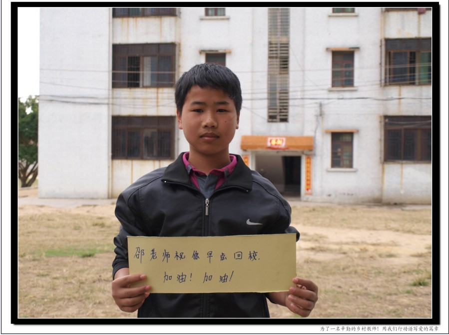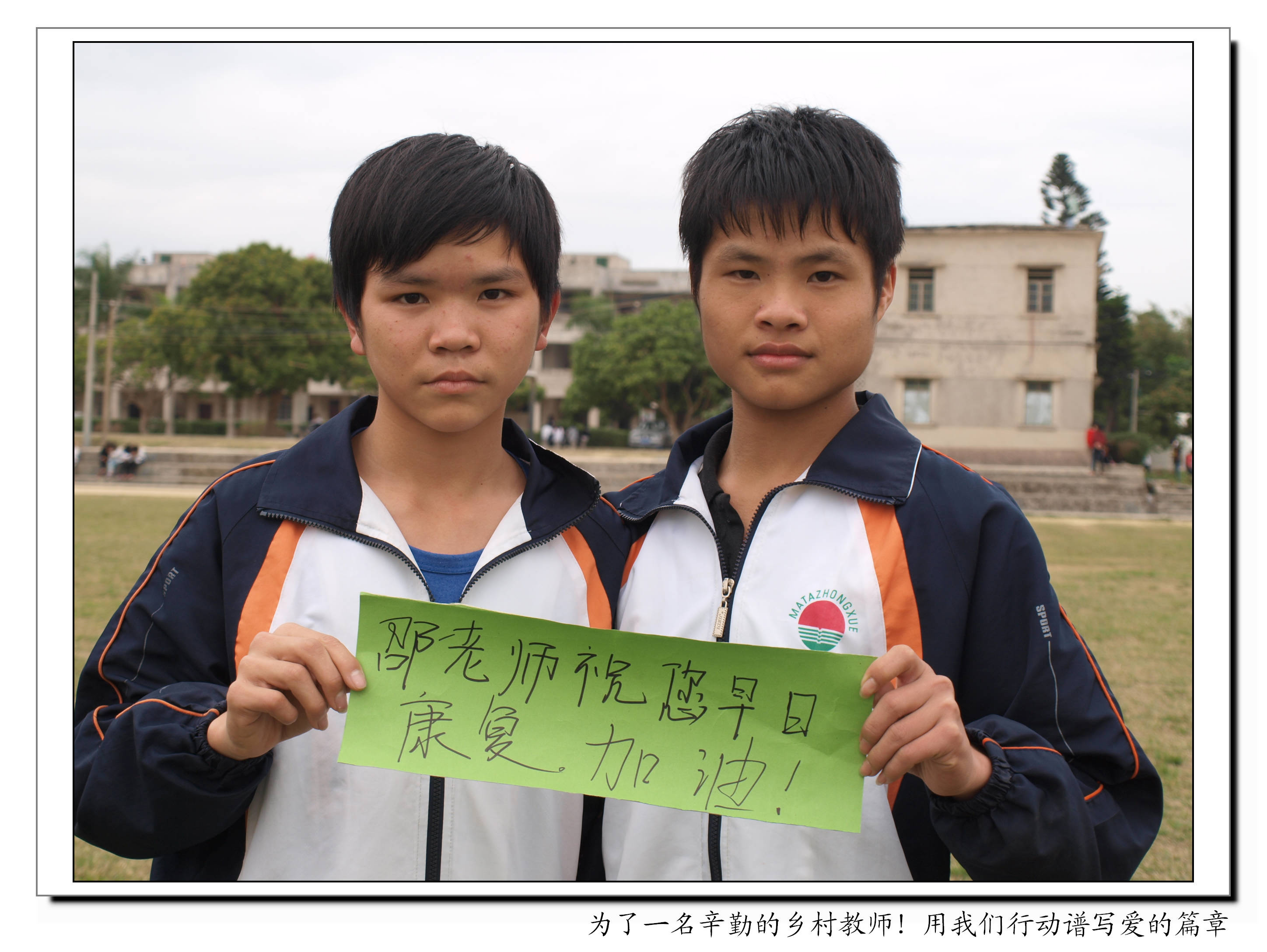QUOTE(游侠918 @ 2011年03月06日 Sunday, 10:15 AM) 祝邵老师早日康复。好老师人助神佑。 图片上写的字好像同一人手笔,且那些学生表情有点…… [snapback]3108737[/snapback] 卡片上的字都是我写的,卡纸也是自己做的,由于当时有这个让学生拿着祝福语的拍照的想法,所以急着自己做了些,星期五那天自己就带着学生去拍了几张。要说明的是,祈福不是学生自发的,但看到老师这样做的时候,他们也非常踊跃。现在校长获悉了,准备下个星期让团委组织学生一起开展这项爱心活动,我相信不管这个活动形式如何,大家都是很支持的! 还有关于学生拍照的时候的表情,很多同事说跟楼上的一样!可是我觉得支持邵老师,为他打气我们就不要太悲,因为照片的祝福语都是送给邵老师一个人的,让他看到曾经在学校看到那些灿烂可爱的面孔,他会更坚强起来。当然,照片传到论坛上,网友们也会看到会做出各种猜想,不过我觉得孩子的真心的善意超乎了所有不必要的疑虑!