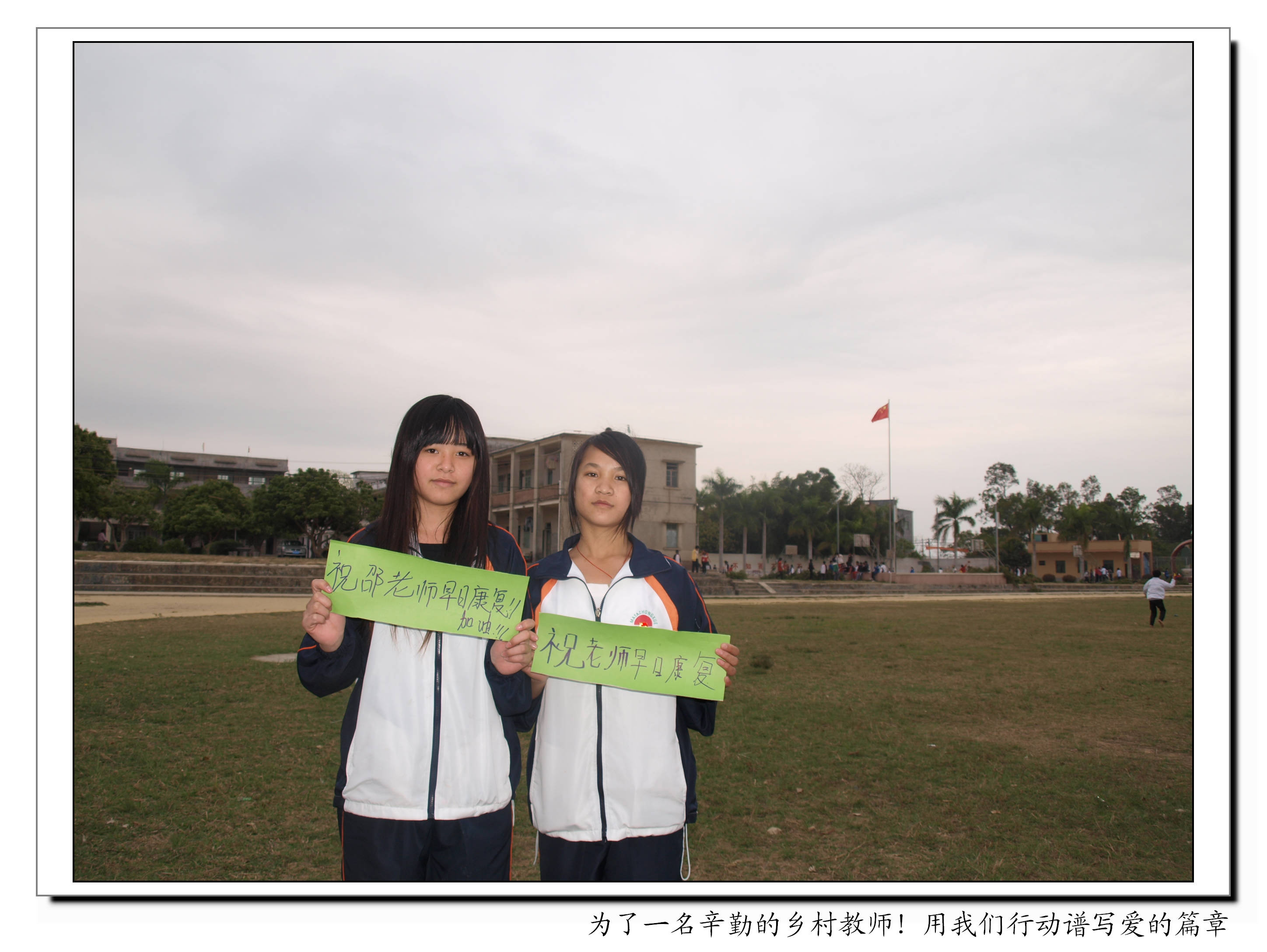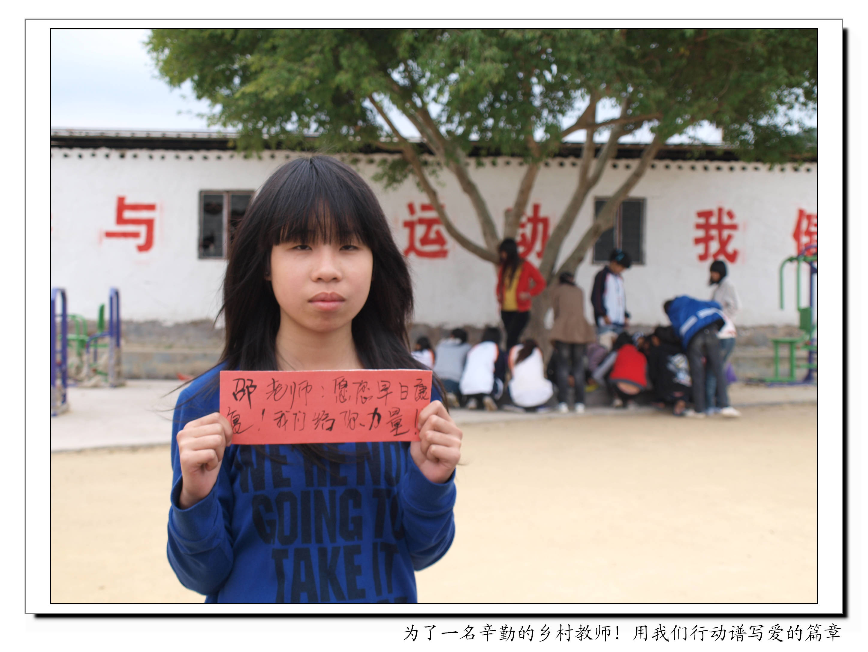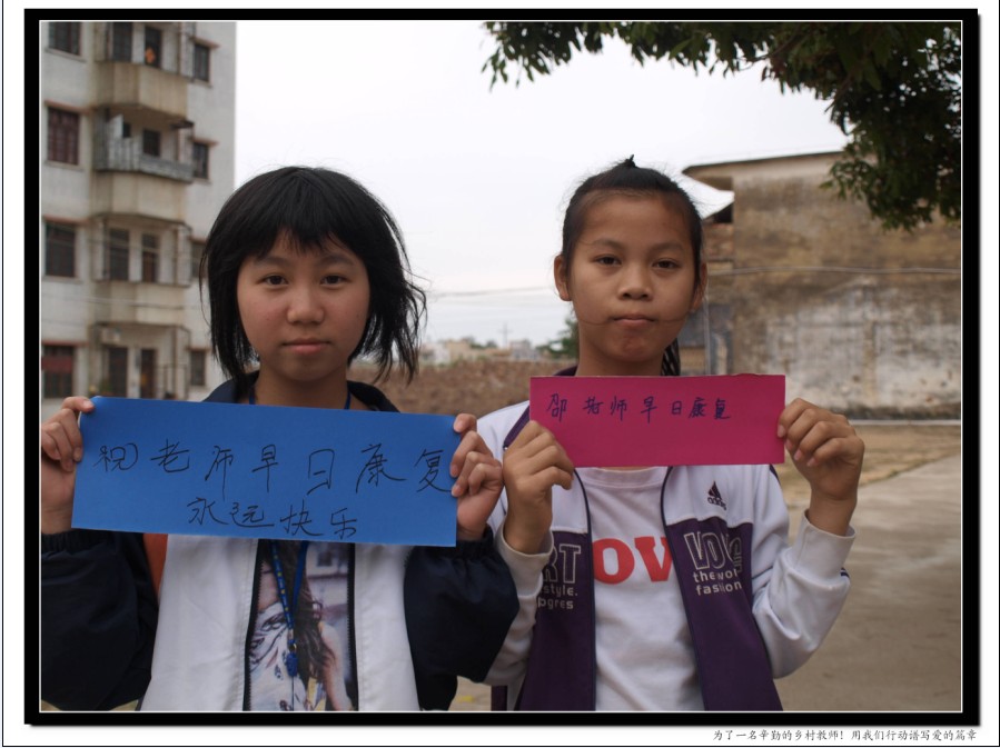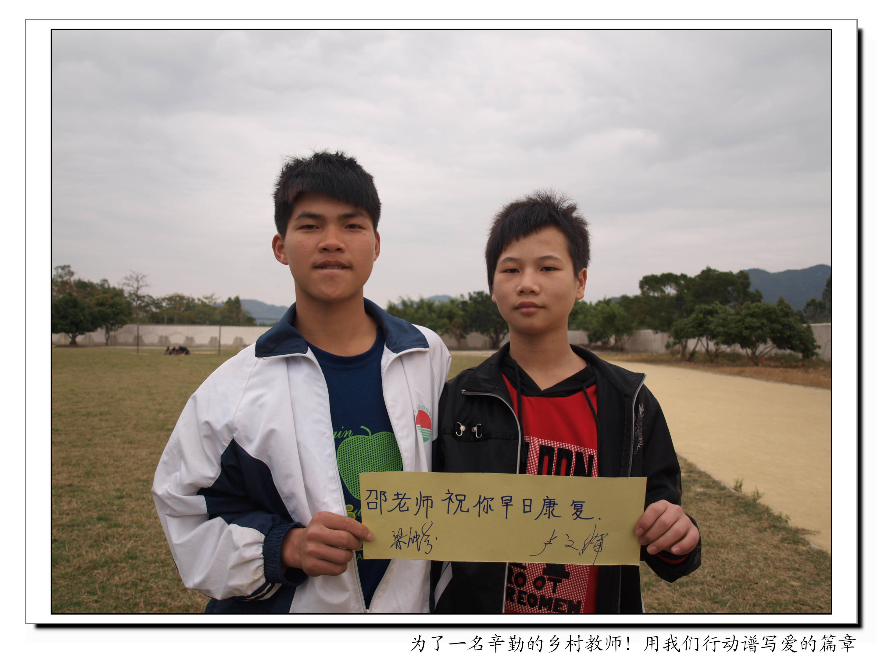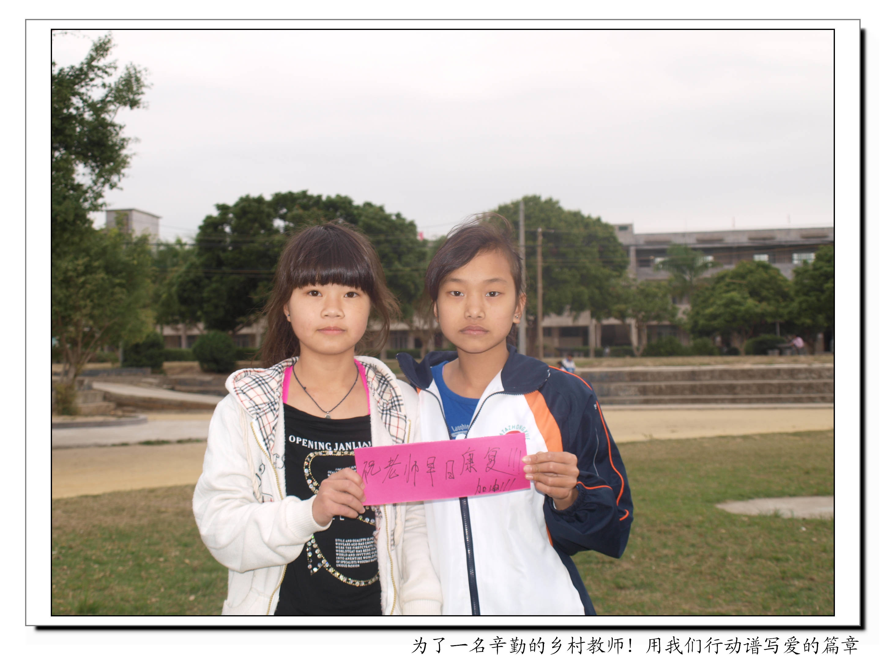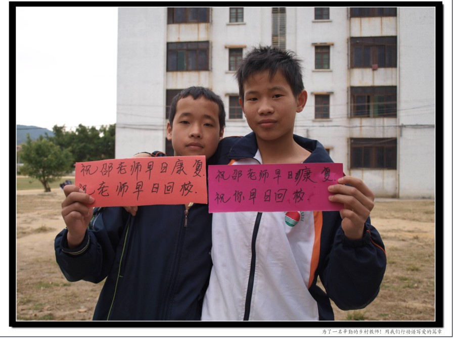 QUOTE(游侠918 @ 2011年03月06日 Sunday, 10:15 AM) 祝邵老师早日康复。好老师人助神佑。 图片上写的字好像同一人手笔,且那些学生表情有点…… [snapback]3108737[/snapback] 卡片上的字都是我写的,卡纸也是自己做的,由于当时有这个让学生拿着祝福语的拍照的想法,所以急着自己做了些,星期五那天自己就带着学生去拍了几张。要说明的是,祈福不是学生自发的,但看到老师这样做的时候,他们也非常踊跃。现在校长获悉了,准备下个星期让团委组织学生一起开展这项爱心活动,我相信不管这个活动形式如何,大家都是很支持的! 还有关于学生拍照的时候的表情,很多同事说跟楼上的一样!可是我觉得支持邵老师,为他打气我们就不要太悲,因为照片的祝福语都是送给邵老师一个人的,让他看到曾经在学校看到那些灿烂可爱的面孔,他会更坚强起来。当然,照片传到论坛上,网友们也会看到会做出各种猜想,不过我觉得孩子的真心的善意超乎了所有不必要的疑虑!