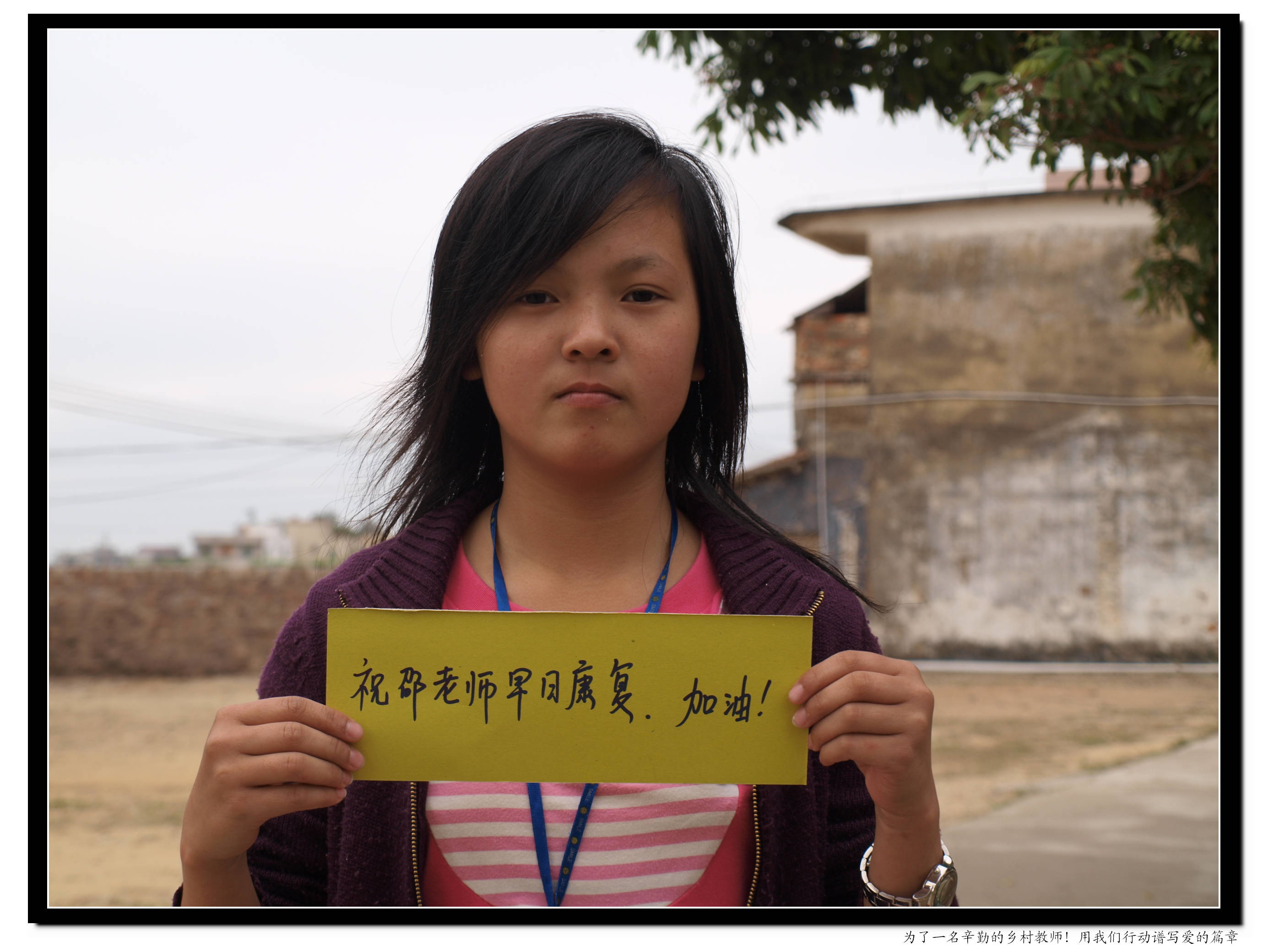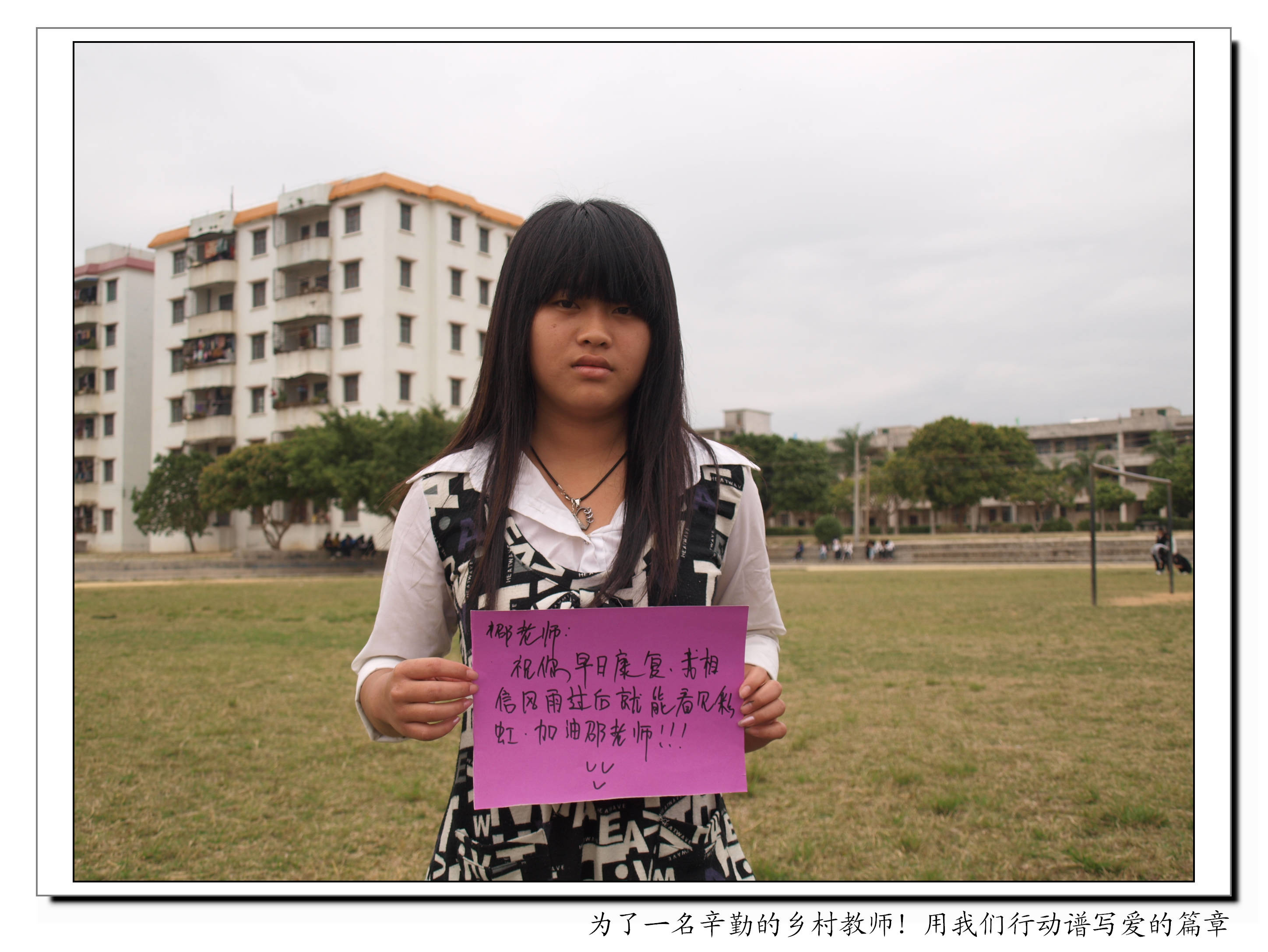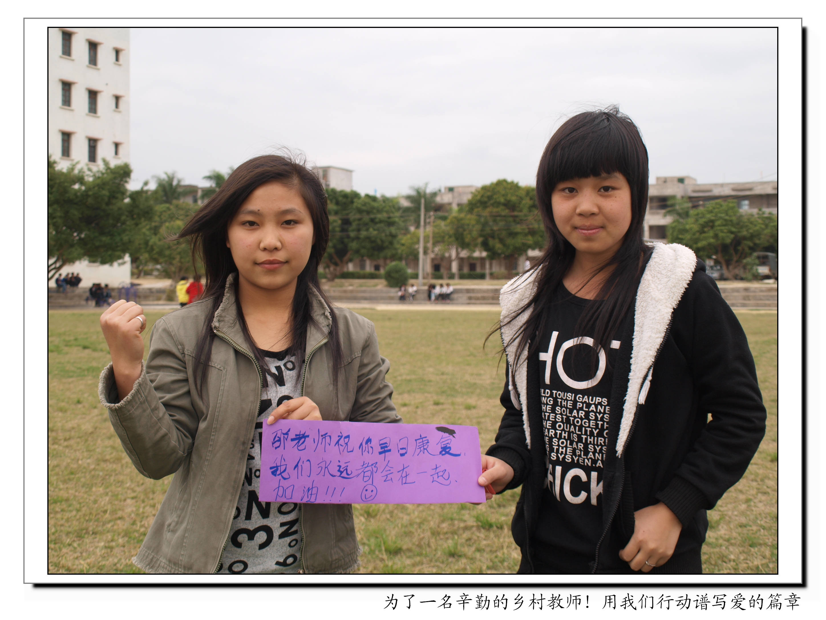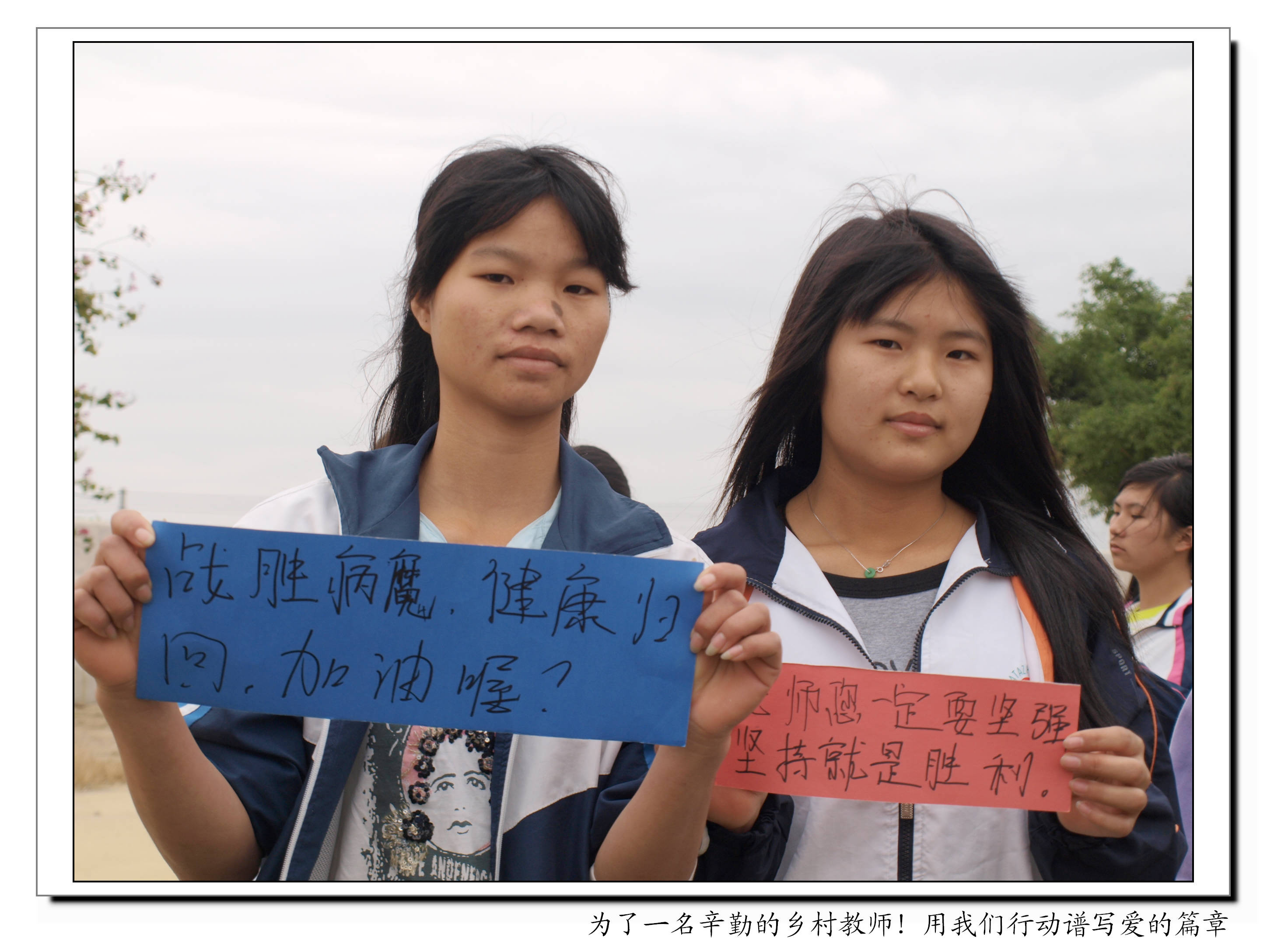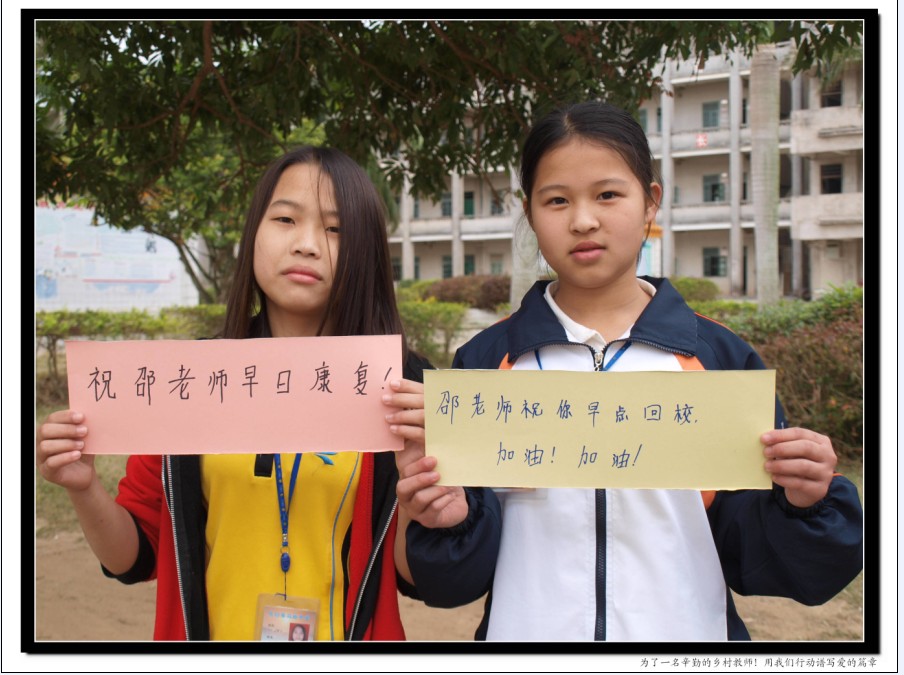 QUOTE(游侠918 @ 2011年03月06日 Sunday, 10:15 AM) 祝邵老师早日康复。好老师人助神佑。 图片上写的字好像同一人手笔,且那些学生表情有点…… [snapback]3108737[/snapback] 卡片上的字都是我写的,卡纸也是自己做的,由于当时有这个让学生拿着祝福语的拍照的想法,所以急着自己做了些,星期五那天自己就带着学生去拍了几张。要说明的是,祈福不是学生自发的,但看到老师这样做的时候,他们也非常踊跃。现在校长获悉了,准备下个星期让团委组织学生一起开展这项爱心活动,我相信不管这个活动形式如何,大家都是很支持的! 还有关于学生拍照的时候的表情,很多同事说跟楼上的一样!可是我觉得支持邵老师,为他打气我们就不要太悲,因为照片的祝福语都是送给邵老师一个人的,让他看到曾经在学校看到那些灿烂可爱的面孔,他会更坚强起来。当然,照片传到论坛上,网友们也会看到会做出各种猜想,不过我觉得孩子的真心的善意超乎了所有不必要的疑虑!
