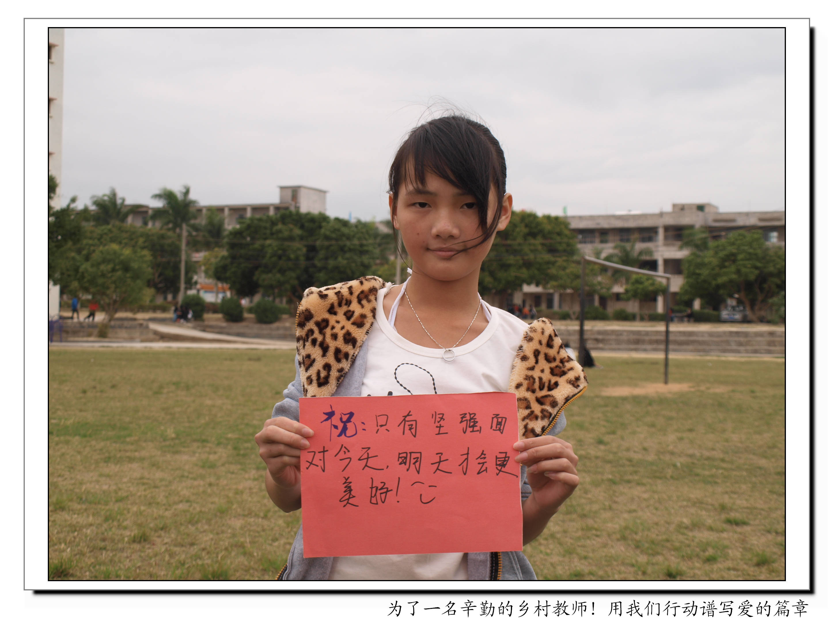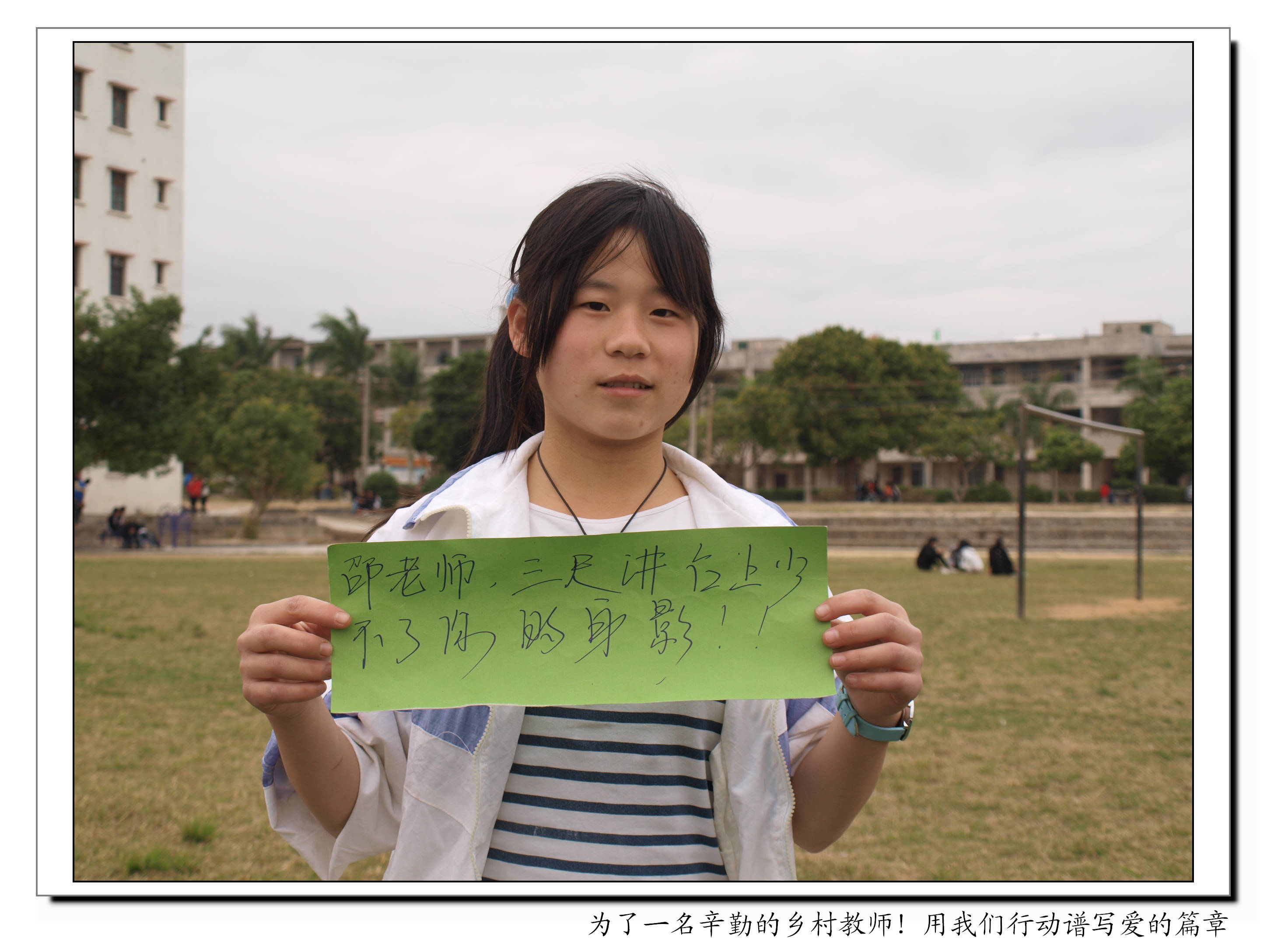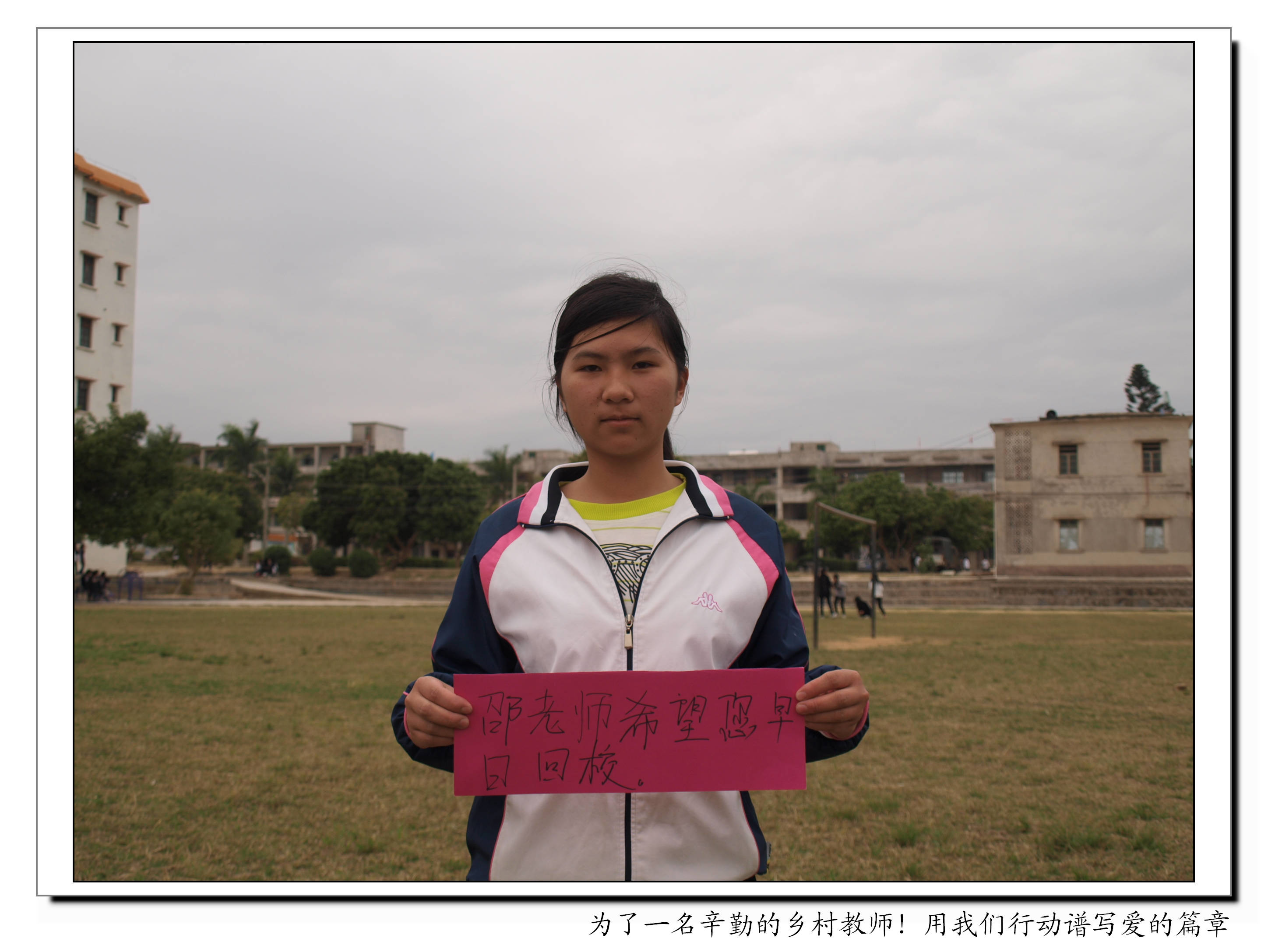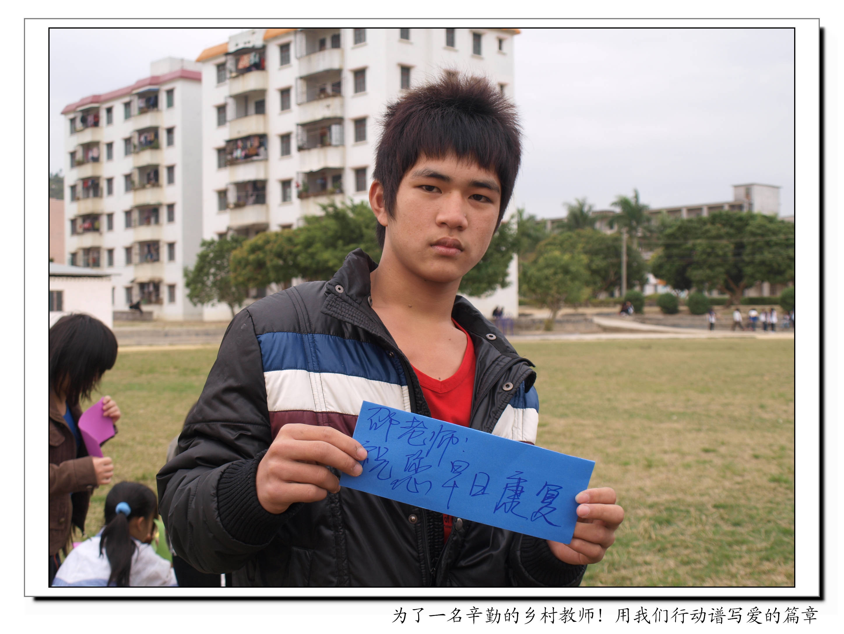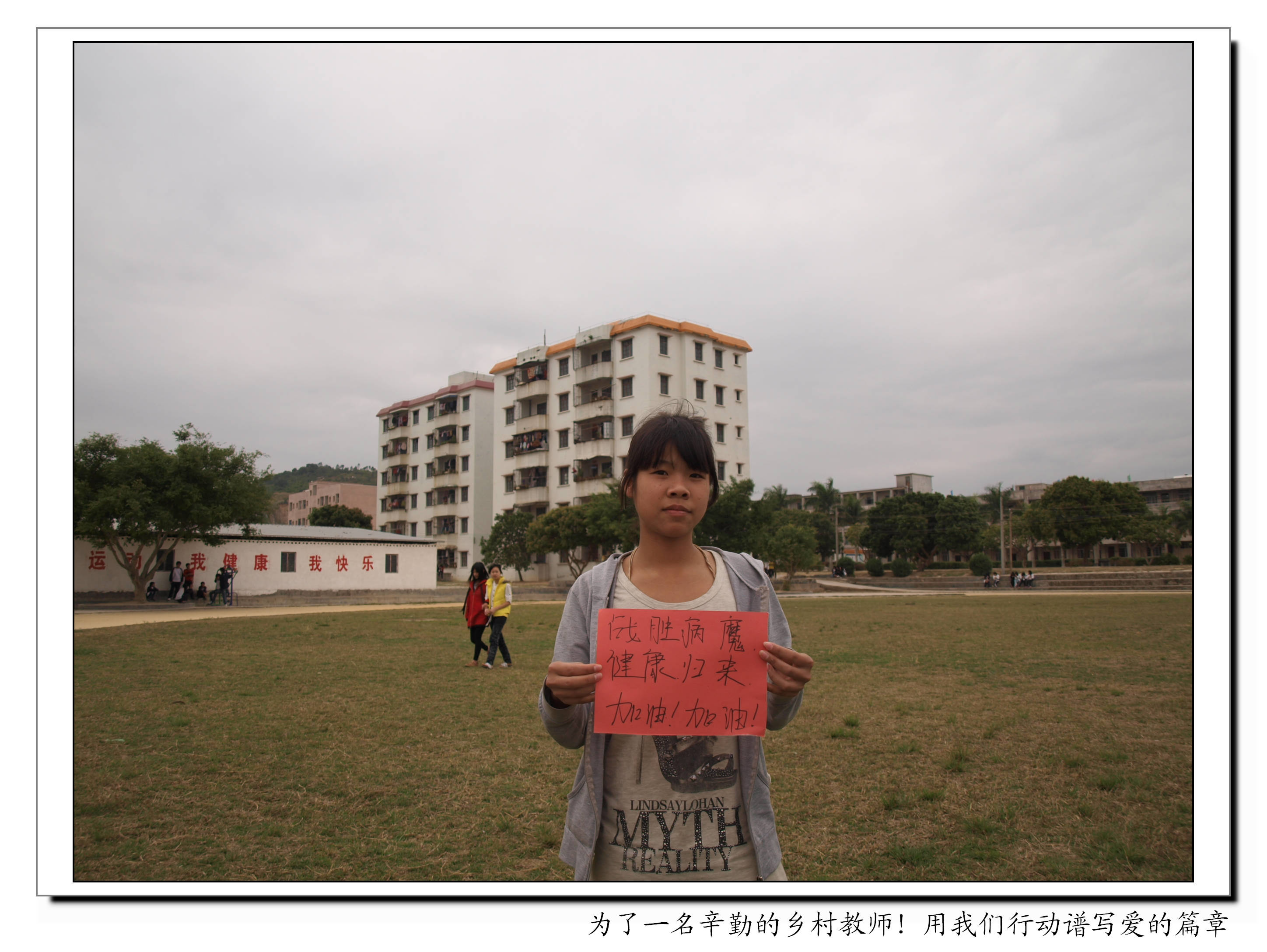 QUOTE(游侠918 @ 2011年03月06日 Sunday, 10:15 AM) 祝邵老师早日康复。好老师人助神佑。 图片上写的字好像同一人手笔,且那些学生表情有点…… [snapback]3108737[/snapback] 卡片上的字都是我写的,卡纸也是自己做的,由于当时有这个让学生拿着祝福语的拍照的想法,所以急着自己做了些,星期五那天自己就带着学生去拍了几张。要说明的是,祈福不是学生自发的,但看到老师这样做的时候,他们也非常踊跃。现在校长获悉了,准备下个星期让团委组织学生一起开展这项爱心活动,我相信不管这个活动形式如何,大家都是很支持的! 还有关于学生拍照的时候的表情,很多同事说跟楼上的一样!可是我觉得支持邵老师,为他打气我们就不要太悲,因为照片的祝福语都是送给邵老师一个人的,让他看到曾经在学校看到那些灿烂可爱的面孔,他会更坚强起来。当然,照片传到论坛上,网友们也会看到会做出各种猜想,不过我觉得孩子的真心的善意超乎了所有不必要的疑虑!