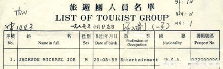 墨绿上衣,笔挺的黑色长裤,黑框大眼镜,友好而安静。这是迈克尔・杰克逊留给刘广志的第一印象。“直到拿到拱北海关的游客名单,我才知道我接待的是迈克尔・杰克逊。”聊起二十多年前的经历,刘广志依然兴奋不已。“名单上写着要派好的车辆和安排好的餐厅,这时我才意识到,天王巨星来了。”在刘广志至今依然保存完好的旅行团名单中,迈克尔・杰克逊的名字被列在第一位,职业一栏,显示为“娱乐业”。