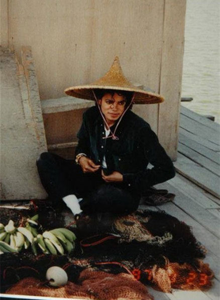4月22日晚,有网友在微博上曝光了一组已故巨星迈克尔・杰克逊1987年游览中国广东中山的图片。在曝光的图片中,杰克逊头戴斗笠,身穿简单T恤。