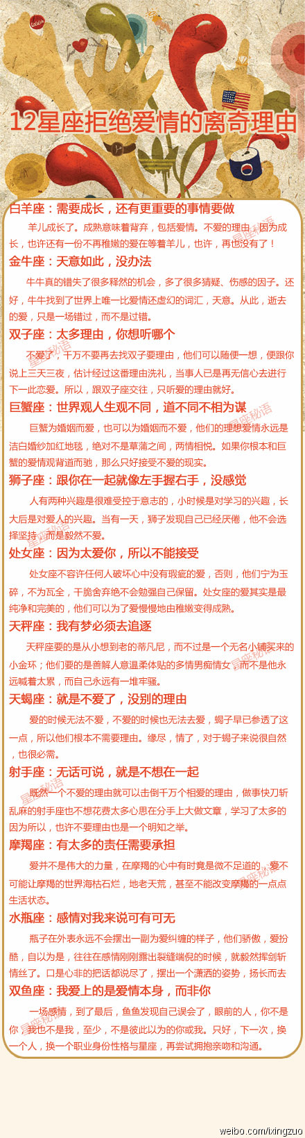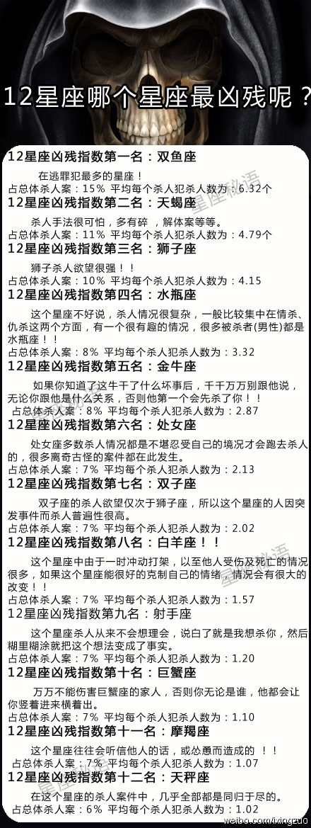 【跟哪个星座吵架永远吵不赢】 NO.1 双子座。NO.2 处女座。NO.3 天枰座。NO.4 天蝎座。NO.5 射手座。NO.6 水瓶座。NO.7 白羊座。NO.8 狮子座。NO.9 双鱼座。NO.10 摩羯座。NO.11 巨蟹座。NO.12 金牛座。珍惜排在后面的星座朋友吧~~@占星小百科