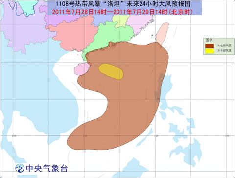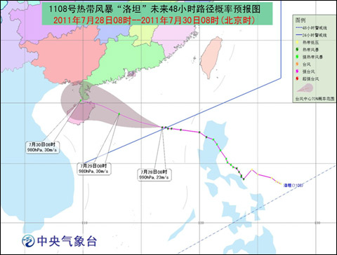 受“洛坦”和西南季风的共同影响,29日20时至30日20时,南海大部、琼州海峡、北部湾、海南沿海、广东中西部沿海及珠江口、广西沿海将有7-8级大风,“洛坦”中心经过的附近海面或地区的风力有9-10级;广东西南部、广西南部、海南等地有大到暴雨,其中海南大部有大暴雨,海南西南部和东部的局部地区有特大暴雨。
