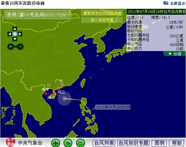 今年第8号热带风暴“洛坦”的中心28日10时位于海南省文昌市东偏南方大约600公里的南海东部海面上,就是北纬18.0度、东经116.3度,中心附近最大风力9级(23米/秒),中心最低气压990百帕